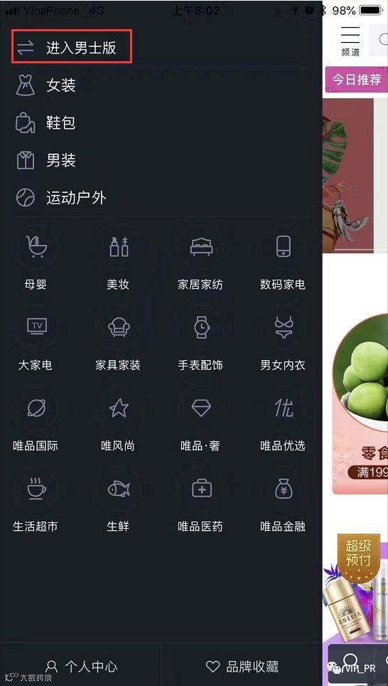 在本次唯品会男士版的入口设置上,可以看到,其与唯品会APP原版本上的垂直内容频道已经打通,直接点击首页左面频道栏“进入男士版”,即出现全新页面,男士精选、运动、数码、生活等多个一级品类可供用户选择。