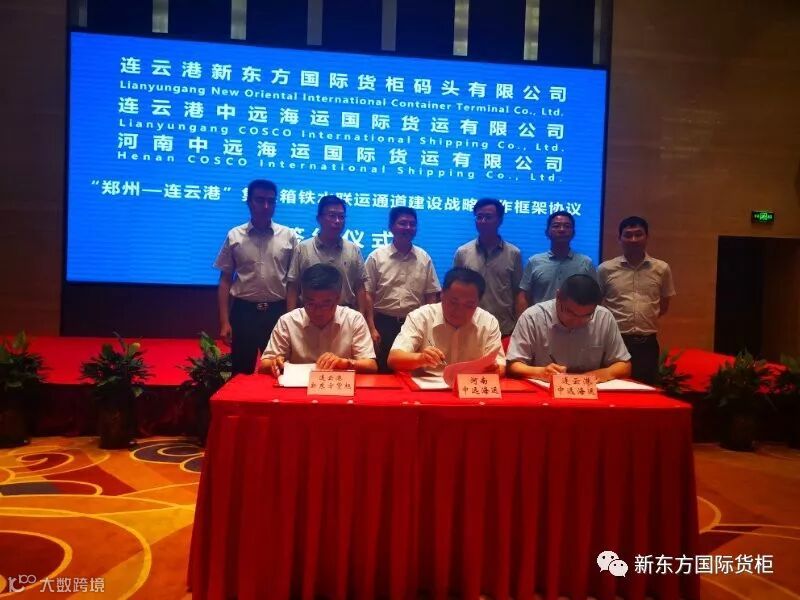 会上,连云港新东方国际货柜、连云港中远海运、河南中远海运三方共同签订集装箱铁水联运通道建设战略合作框架协议;上海郁州海运有限公司与郑州凯乐货物运输服务有限公司签订战略合作协议。中国铁路郑州局营销处华丹隆主任、中铁集郑州分公司高增金总经理、开封自贸区赵志亮副主任、郑州经开区于万和副局长、河南储备局四三一处郝宁副处长、连云港港口控股集团朱向阳总裁共同见签此次合作。