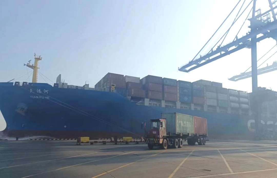 通过这两条船的及时靠泊、卸船、提箱,进口空箱顺利衔接,缓解了船公司空箱“断粮”危机,使得船公司的备年货计划顺利进行。