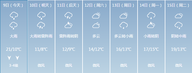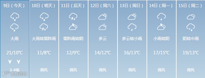 今日广州地区已全面落雨,但白天的气温还未开始下降;近傍晚时(就是现在),会有较明显的降水过程,并可能伴有雷雨大风等强对流天气,温度开始直线下降,导致明日(10号)白天最高温度仅为11度!