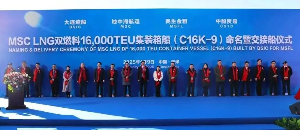 1月9日,中船天津联合中船贸易为民生金融租赁股份有限公司建造的华北地区首艘LNG双燃料16000TEU集装箱船提前合同期172天命名交付。