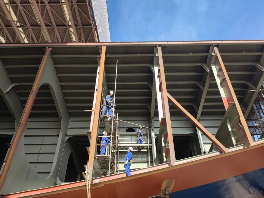同时积极协调各科室车间、班组,促进信息共享和资源整合,及时研究解决吊运过程中遇到的系列问题,仅用86天完成116个分段的总组,提前3天完成计划;32个总段吊装,已完成21个合拢吊装,剩余总段全力以赴加紧吊装。