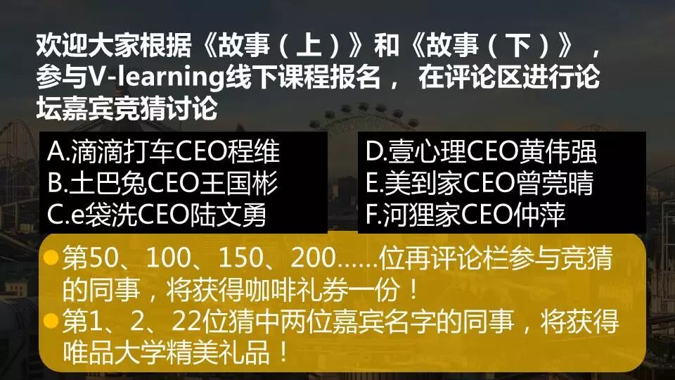 导读:“V创业”论坛O2O大咖驾到!他们的故事你们看了吗?猜到他们是谁吗?报名论坛见CEO,参与竞猜活动赢礼品!唯品大学福利来袭!