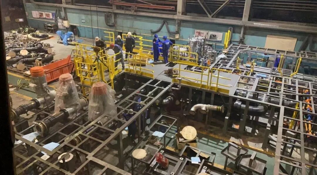 大船舾装单元制造部未雨绸缪,在项目启动前期研究制定假腿施工方案,组织相关部门进行评审并顺利通过。将火焰限制器平台单元的框架结构及下方管路系统分成5个小单元进行施工,平台上方管路系统预组立安装,在保证运输的前提下,最大化保证单元完整性。在二工场作业场地,对火焰限制器平台5个小单元、平台上方管路预组立进行合拢施工。经过施工人员的共同努力,火焰限制器平台单元比计划提前约20天完工,得到船东一致好评。