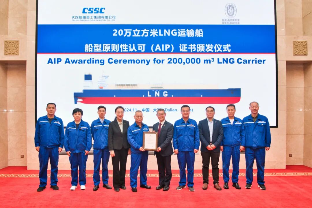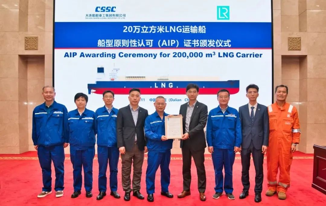 近日,中国船舶大连造船自主开发的20万立方米液化天然气(LNG)运输船分别获得法国船级社(BV)和英国劳氏船级社(LR)颁发的原则性认可(AIP)证书。