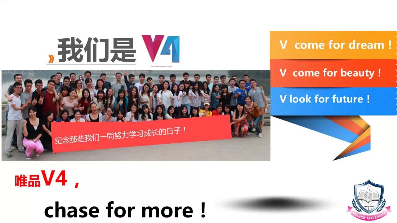唯品V4,chase for more,这不仅仅是一句口号,更是一种动力,半年的历练和收获,让我们更加坚定,更加无畏。祝福我们的V4小伙伴,让我们在未来的唯品会的VIP职业旅程中走得更加稳健!更加漂亮!