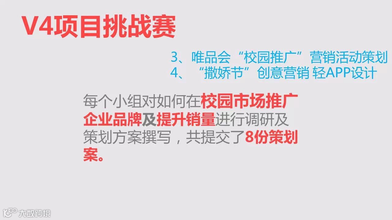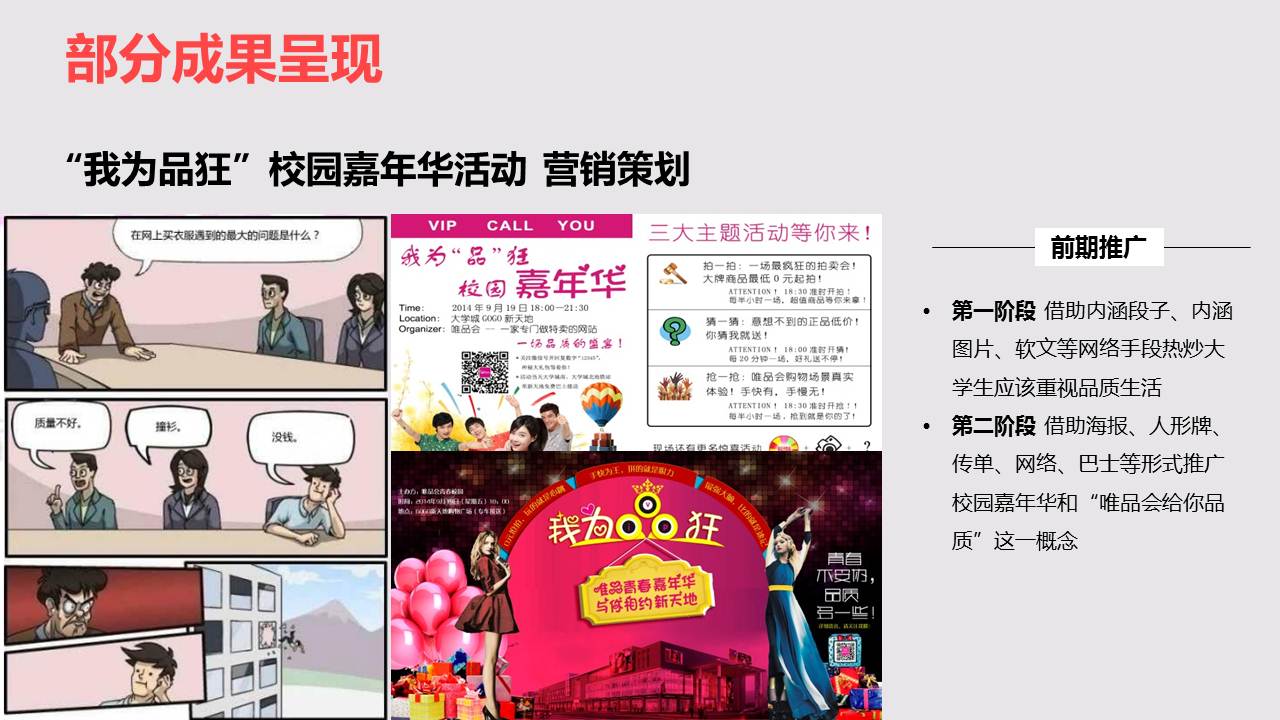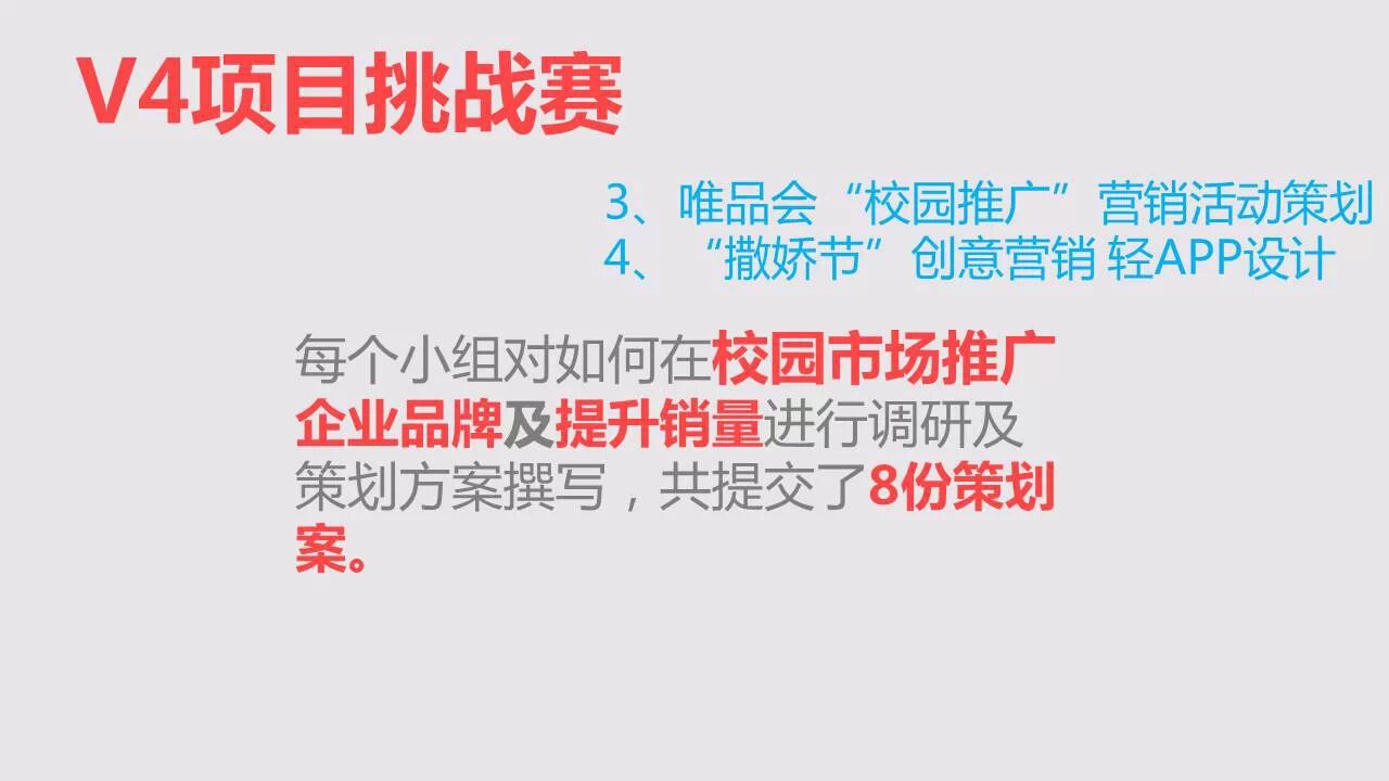 其实,锻炼我们小伙伴们的不仅仅是四大业务岗位的轮岗学习,其中,四大项目的比拼和完成同样给了我们很大的成长空间。半年的时间,我们一共接手了4个项目,分别为唯品会“校园推广营销活动策划“、“撒娇节”创意营销轻APP设计、企业文化事例访谈以及技术中心的“古腾堡”项目。在接手项目之初,伙伴们成立了各自的项目组,每组协作完成项目,最终评选出三个优秀项目组,跟着小编看看他们项目组风采及项目成果吧!