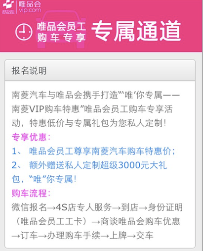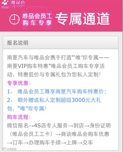购车惊喜来袭!现广州南菱汽车专为你们打造‘唯’你专属——南菱VIP购车特惠”专享活动!南菱汽车将为唯品会全体员工私人定制“唯品会员工购车专享价”!享受超低特惠价的同时,还可获3000元的超级礼包!有炫酷时尚、成熟稳重等多种车型任君选择!相信热爱生活的你总能找到合适自己的一款车!