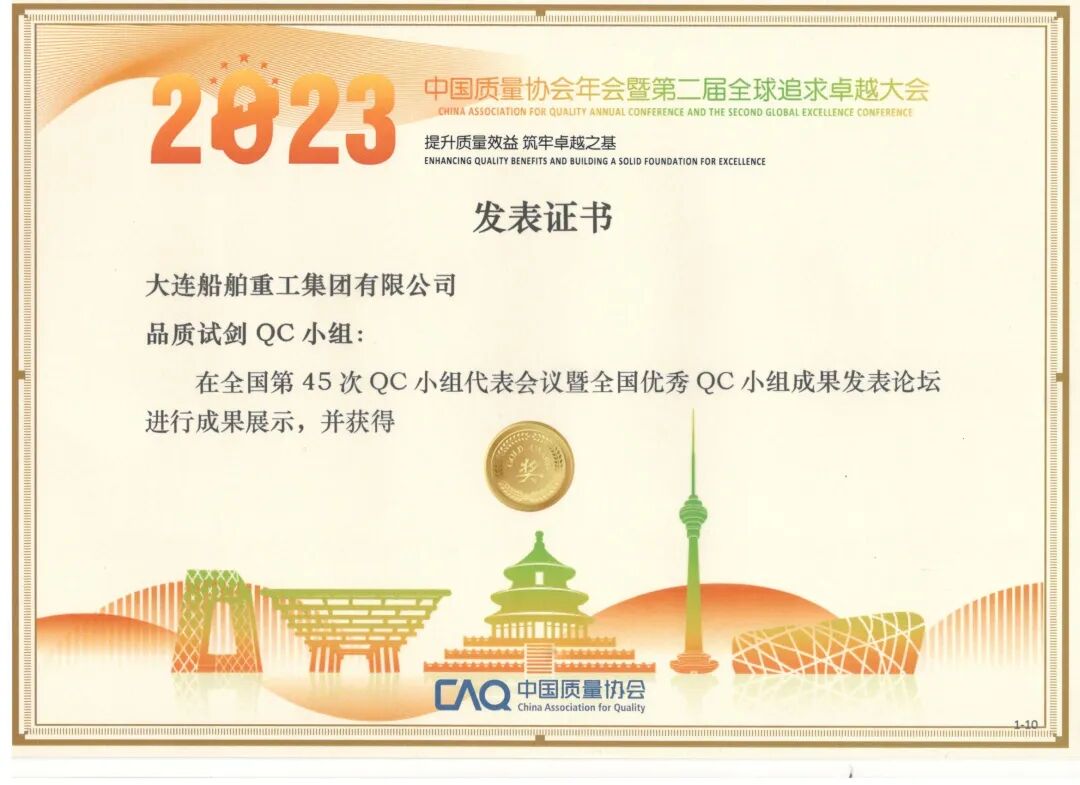 12月1日至2日,中国质量协会在北京会议中心组织召开2023中国质量协会年会暨第二届全球追求卓越大会,会议期间举行了全国质量奖、中国质量协会质量技术奖、全国优秀QC小组等颁奖仪式。中国船舶大连造船质量保证部品质试剑QC小组荣获2023年度全国优秀QC小组,小组成员代表在全国第45次QC小组代表会议暨全国优秀QC小组成果发表论坛上进行成果展示,并荣获发表金奖。