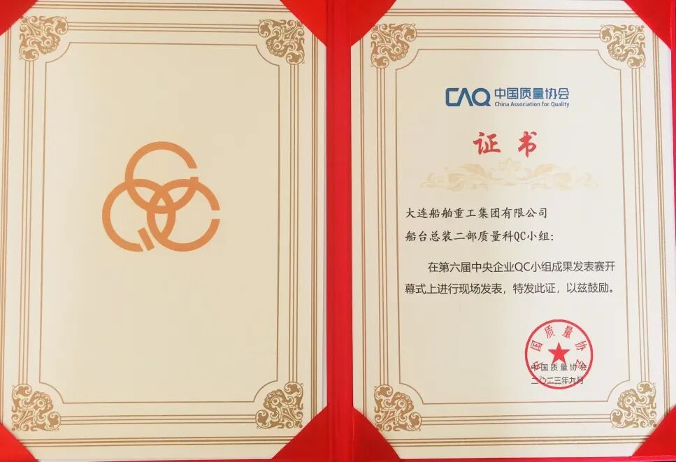 2023年,大连造船质量管理活动在各级领导和相关单位的鼎立支持下取得了丰硕成绩,得到中国质量协会、中国船舶集团、辽宁省质量协会、大连市质量协会等上级单位一致好评,屡获殊荣:质量保证部品质试剑QC小组荣获了2023年度全国优秀QC小组;船台二部电装车间电装一班和船台二部船体车间找线班荣获全国质量信得过班组;质量检验部船海启航QC小组、设计院船研所船体室DS小组荣获辽宁省一等奖。