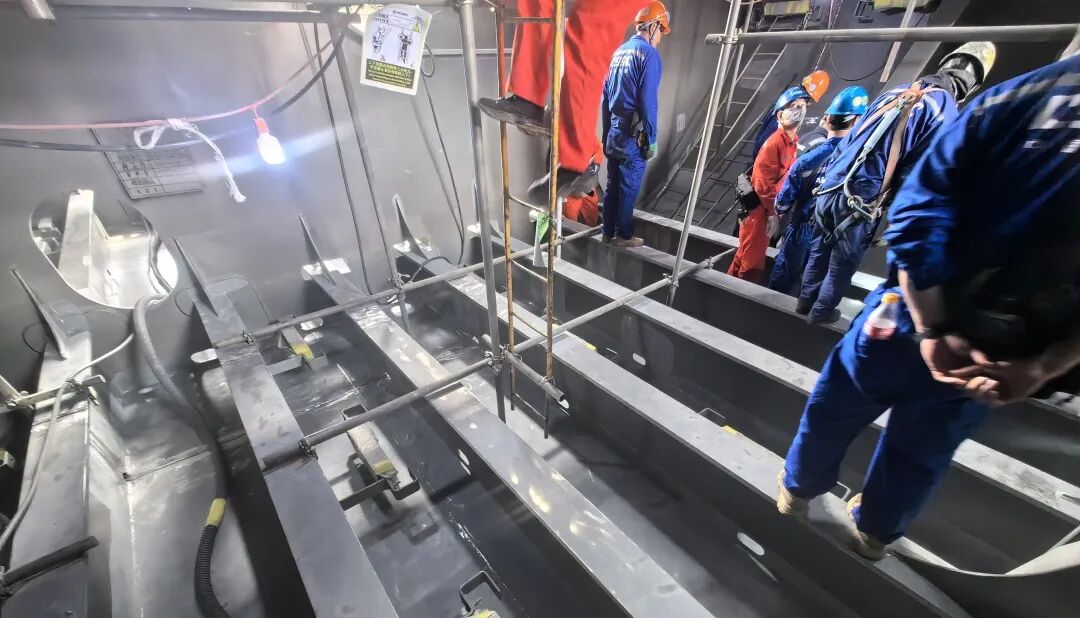大船装备承建的16000TEU集装箱船9号船LNG B型燃料舱已完成收尾施工。16000TEU集装箱船12号船B型燃料舱,持续强化“攻难点、保节点、降成本”,优化施工工艺和分段进线比例,完成该舱最后一个D2分段的吊装合拢任务,实现整舱成型。