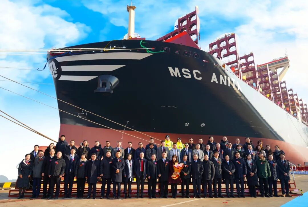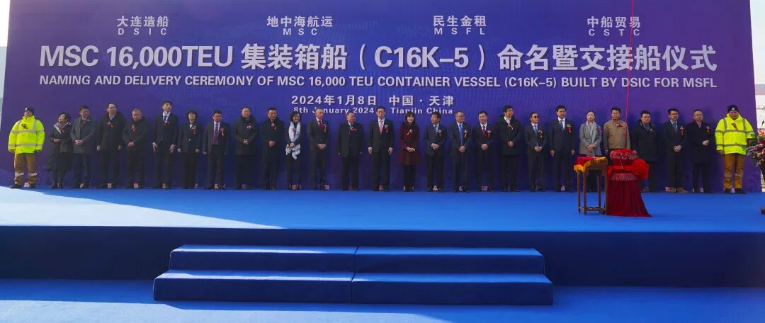 民生金融租赁股份有限公司党委书记、总裁孔祥歌,MSC地中海航运公司全球新造船总监Giuseppe Gargiulo,MSC远东地区新造船经理YoungBo Lee,中船贸易总经理胡凯,大连造船副总经理林吉明及相关单位负责人出席命名暨交接船仪式。教母邓毅女士将该船命名为“MSC ANITA (地中海 安尼塔)”轮。