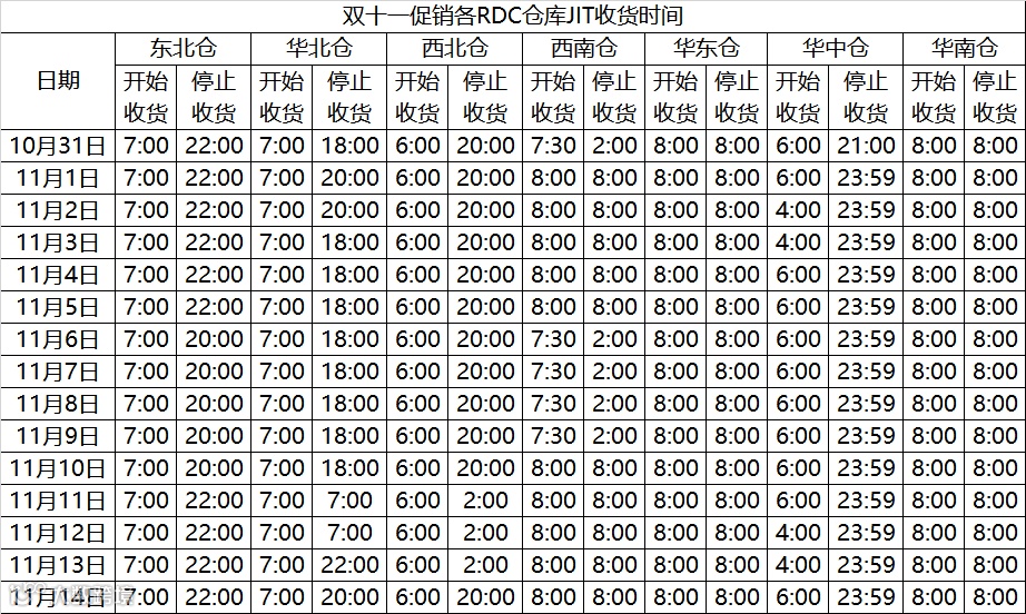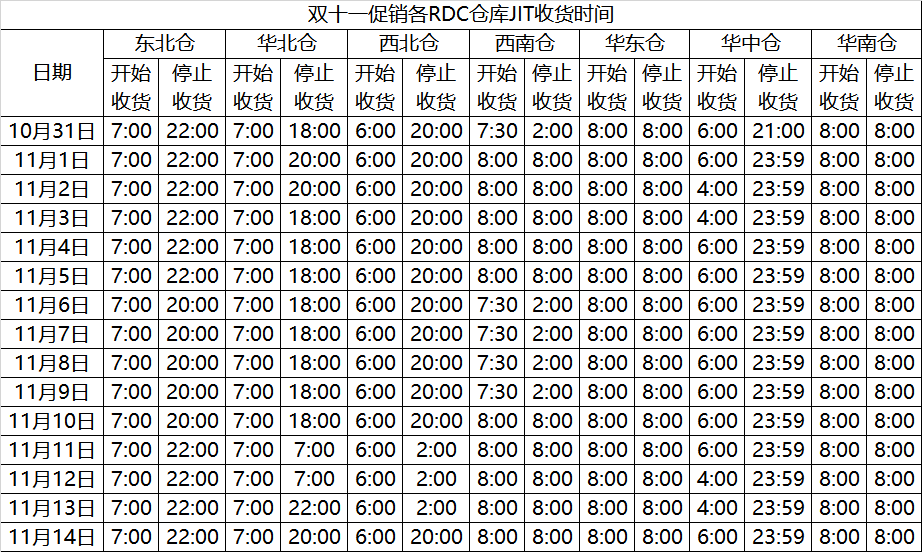 ①大促期间的各仓收货时间: