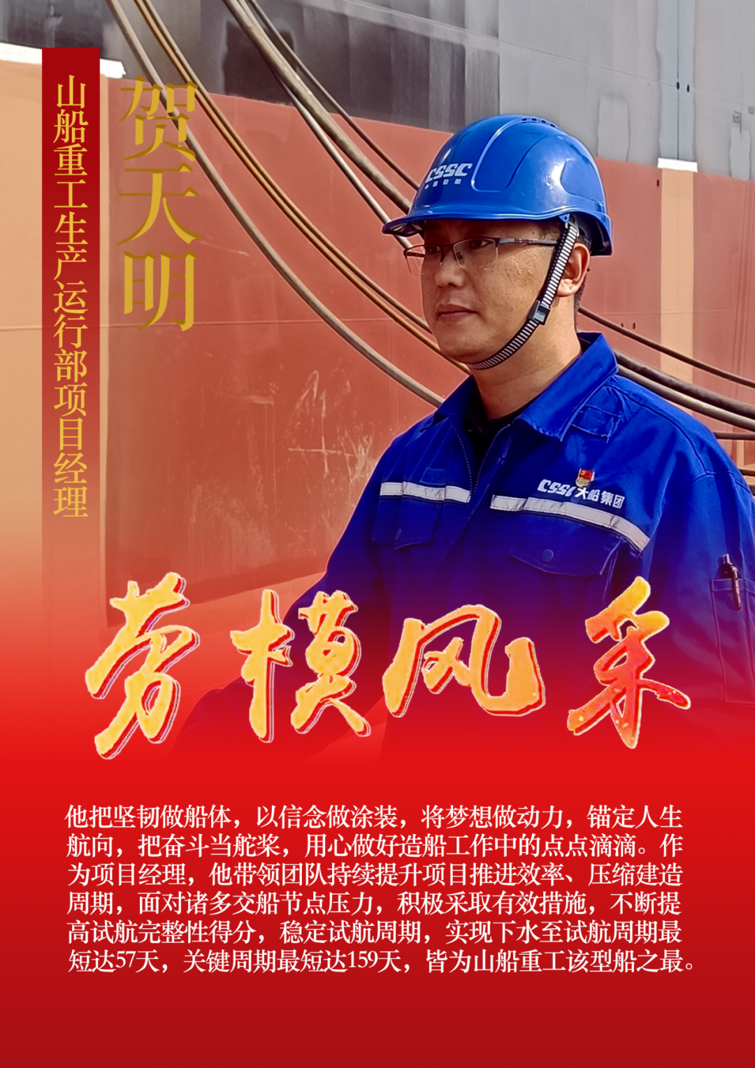贺天明始终以澎湃的热情投身造船,以父辈的足迹“船”承信仰,不忘初心、牢记使命,奔跑在追逐造船梦的路上,把坚韧做船体,以信念做涂装,将梦想做动力,把奋斗当舵桨,用心做好造船工作中的点点滴滴,锚定人生航向,为祖国造船事业贡献力量!