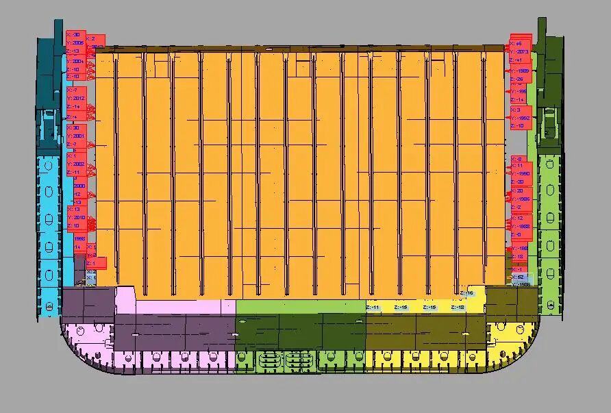班组刘彦伟、王中军、刘明凯等老师傅反复研究细化操作,测量总组与合拢分段的相关数据,借助模拟搭载分析,精准设置下沉反变形量。借助这些操作可以较好指导合拢定位基准、及时开展分段预修整、提升分段定位精度与吊装效率。在充分准备精度控制工作的前提下,艏半段搭载施工按照计划有序推进。