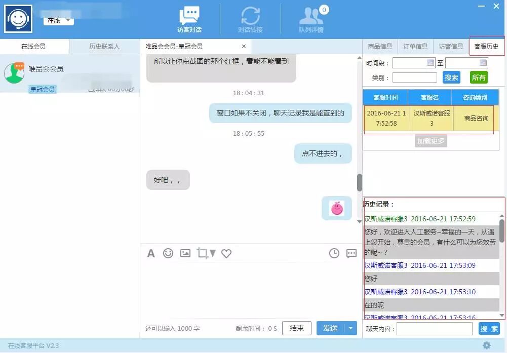 由于我们移动端在会员和客服对话的时候,经常出现会员需要退出聊天窗口查看其它信息的情况,所以当会员再次进入对话的时候,会由新的客服服务,此时“客服历史”情况能帮助客服很好的了解到会员之前的问题,继续帮其服务,不用会员重述。