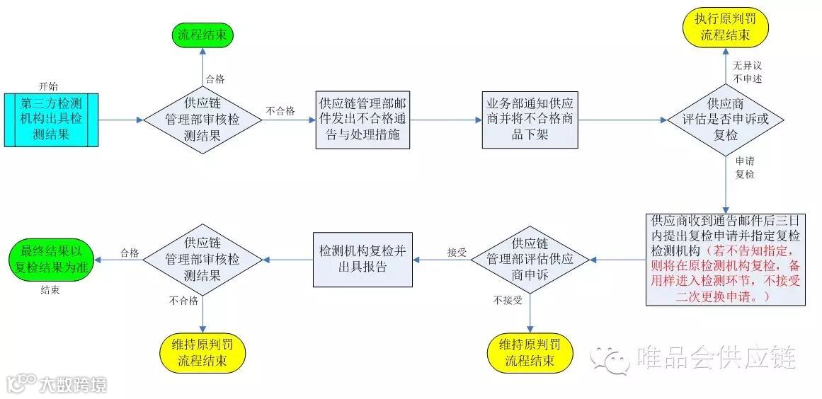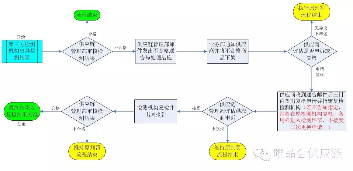 1、内在质量检测初检不合格的,除《唯品会商品质量监督管理办法》中规定不予复检的情况之外,供应商收到检测报告后,对检测结果有异议的可在收到检测报告的三个工作日之内提出申诉和复检申请。