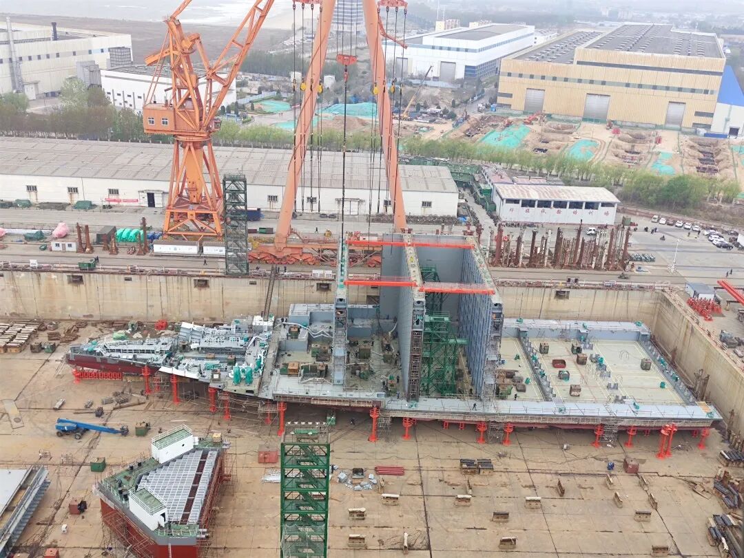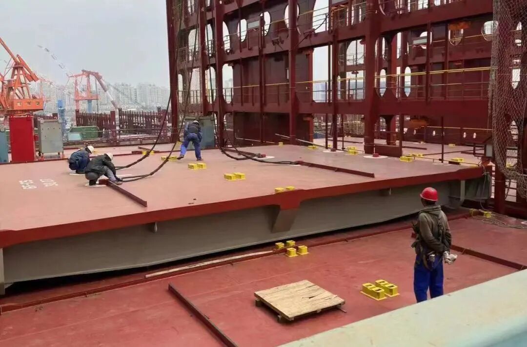 船坞二部在建的16000TEU集装箱船1号船试航状态良好,各单位通力配合,全力保障试航任务顺利完成;16000TEU集装箱船2号船各系统密性试验逐步进行,货舱舱盖施工及主机水下排正工作如火如荼进行;16000TEU集装箱船4号船坞内合拢工作全面展开,分段吊运对接施工有序进行,为轴舵系照光作业奠定基础;16000TEU集装箱船6号船总组工作持续推进,全力保证设备安装进度,提高总组完整性。