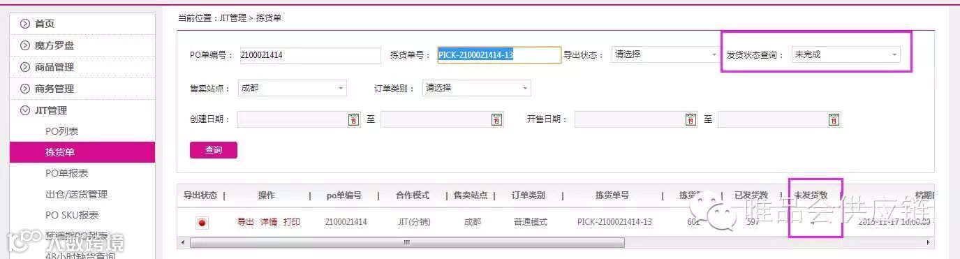 操作规范:请供应商按照实际发货明细进行送货单上传,完成后可查看拣货单--未发货数报表,(例如,PICK-2100021414-13 应发货601,实际仓库配货597,配差4单,系统上传601件的送货单,剩余4单可安排在下一个批次发出,拣货单号沿用之前配差的PICK-2100021414-13,如下图)