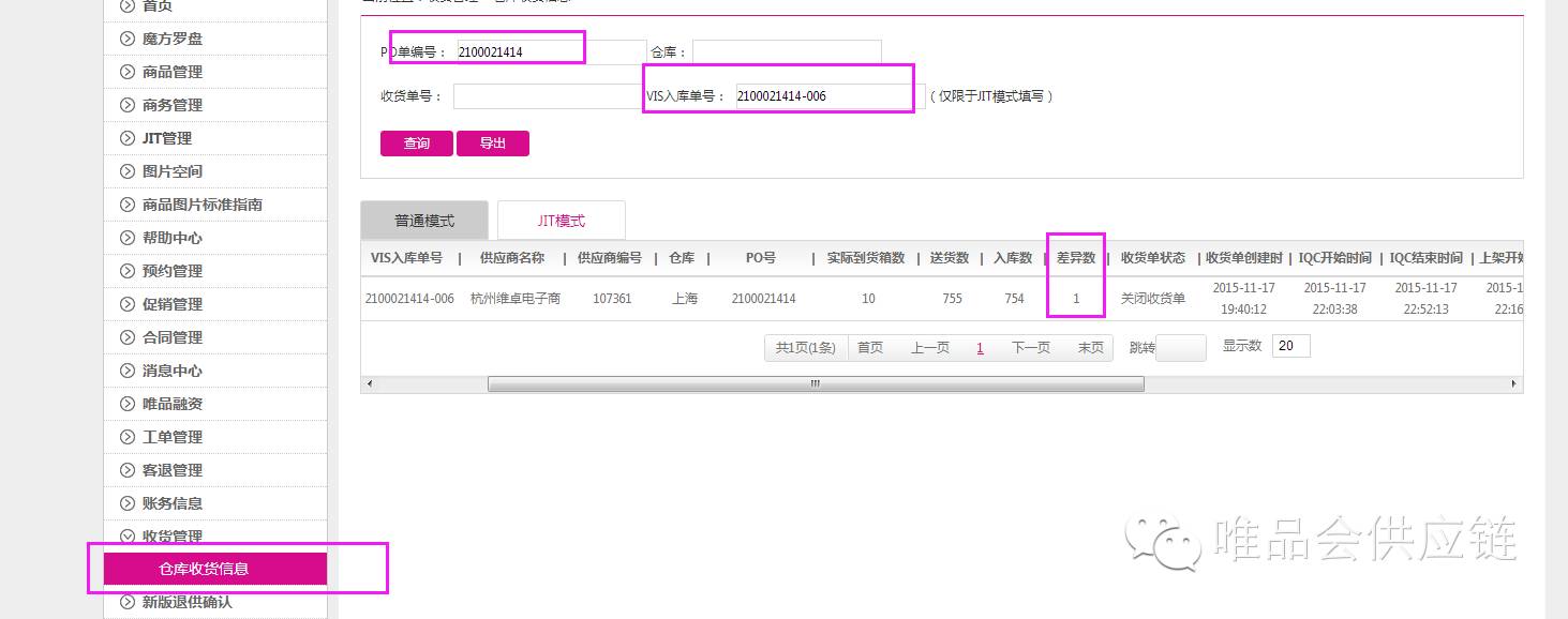 为避免因物流延误造成补货不及时导致订单取消,各位供应商朋友下班前务必查看收货管理系统,查看前一天发货的到货入库情况,发现有差异可以即刻安排补货(例如:发货到上海的入库单号2100021414-006,收货差异1件,果断的补货,嘿嘿)。当然,如果收货都没差异,那么恭喜您可以愉快的度过一个美妙的夜晚。