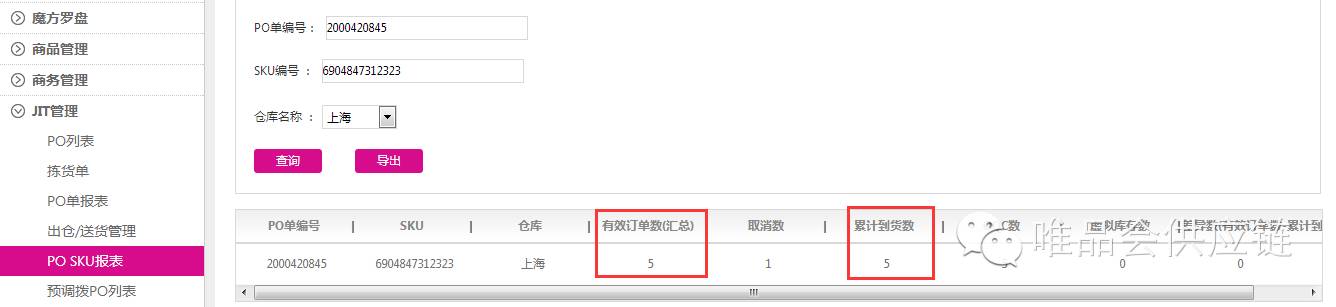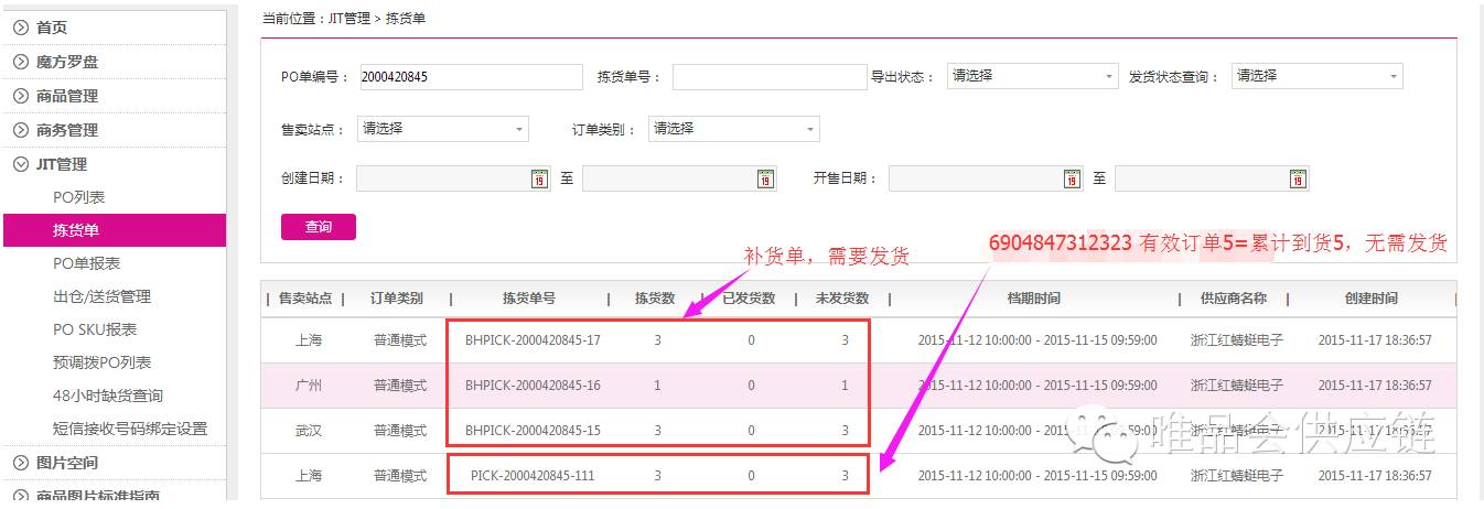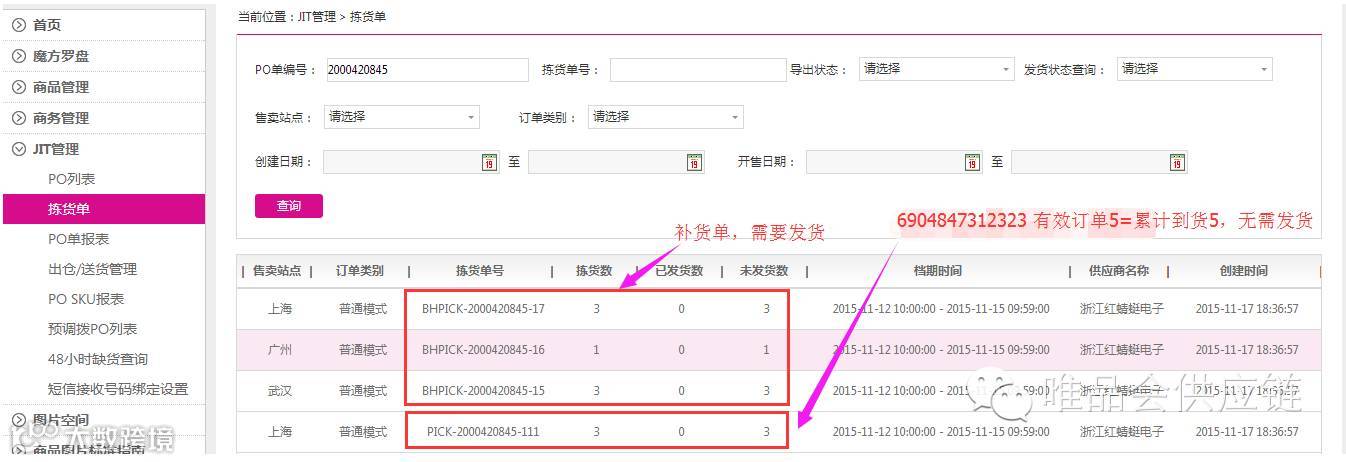 例如:PO 2000420845 15号档期下线,17号创建的拣货单还有一些拣货单,其中PICK-2000420845-111中6904847312323条码经核查结果如下(快速查询路径可在PO SKU报表查询有效订单数和累计到货数):