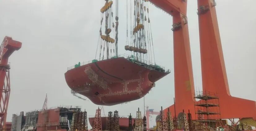 此次联吊是大船天津成立以来实现的首次联吊作业,该总组分段总重1049吨,采用两台800吨吊车联吊,操作难度大、安全风险高。