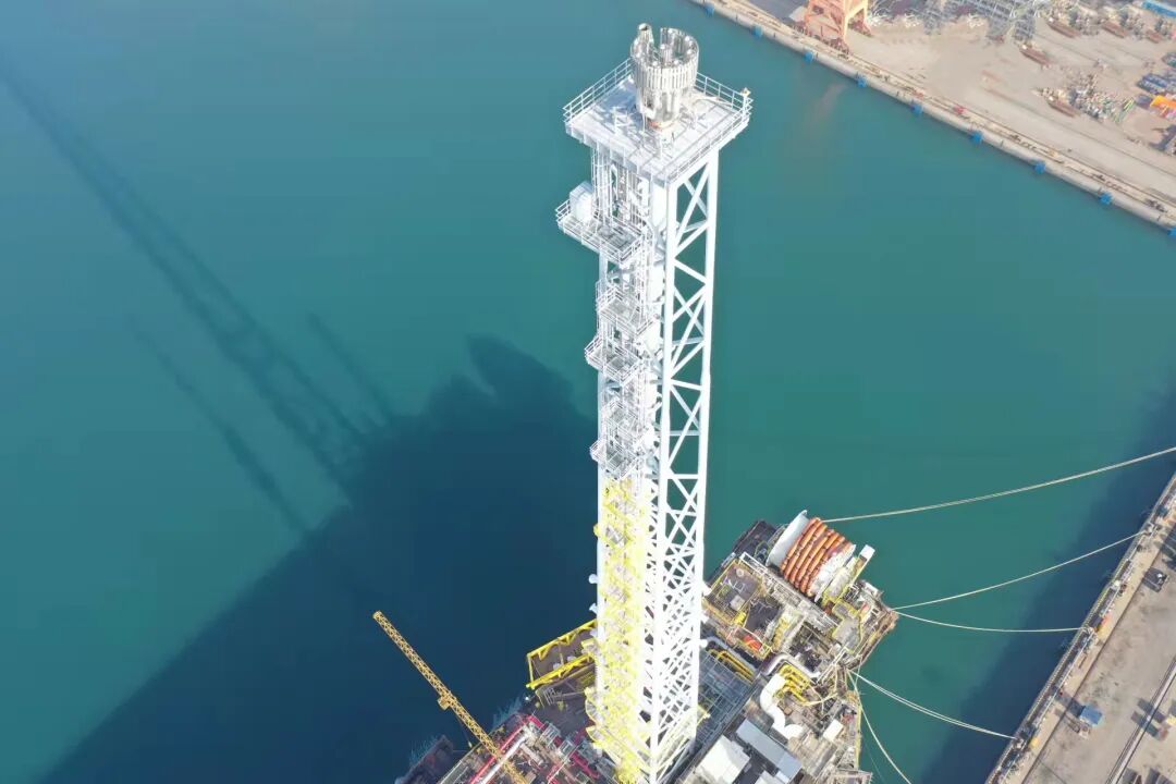 大船长兴在拟定吊装方案后,快速进行生产统筹安排,合理组织调配人力,迅速开展攻坚战,短时间内完成了火炬塔相应的管系和电气安装工程,确保吊装前工程零遗留。随着海吊的起勾,火炬塔塔身缓缓离地,曾经静置的巨人在碧蓝的天空下屹立起身,直冲云霄。