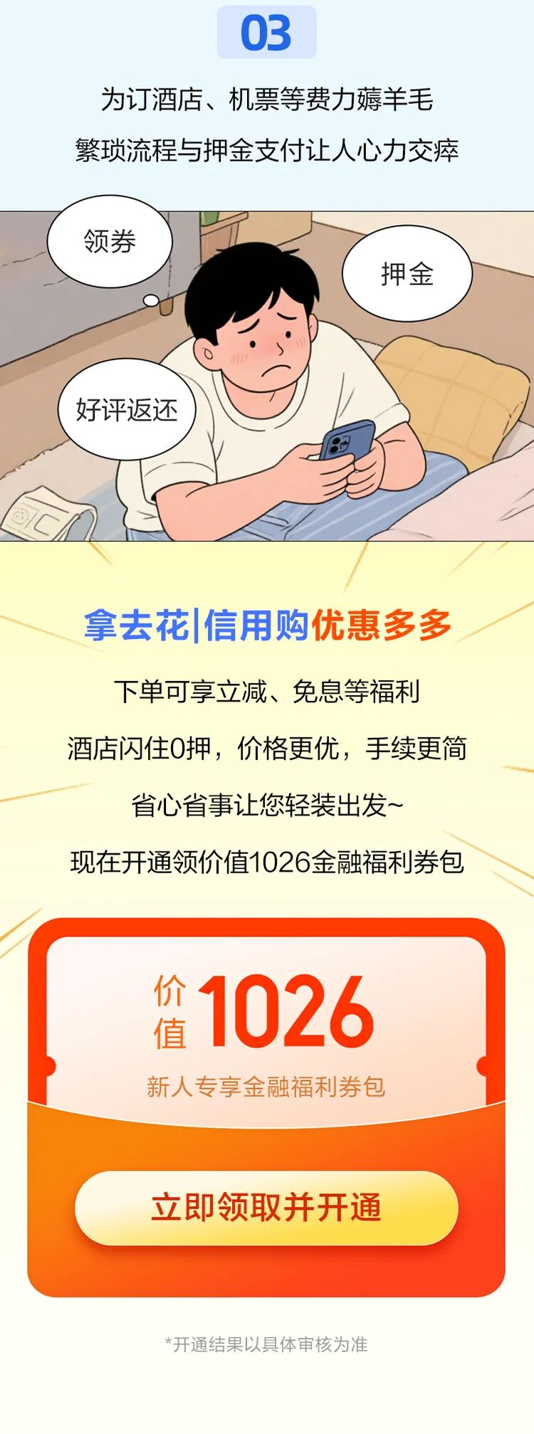 *文中提到的拿去花|信用购页面由携程金融开发,由拿去花|信用购为用户提供信用消费服务。请您理性借贷、合理消费,选择正规渠道使用携程金融相关服务。