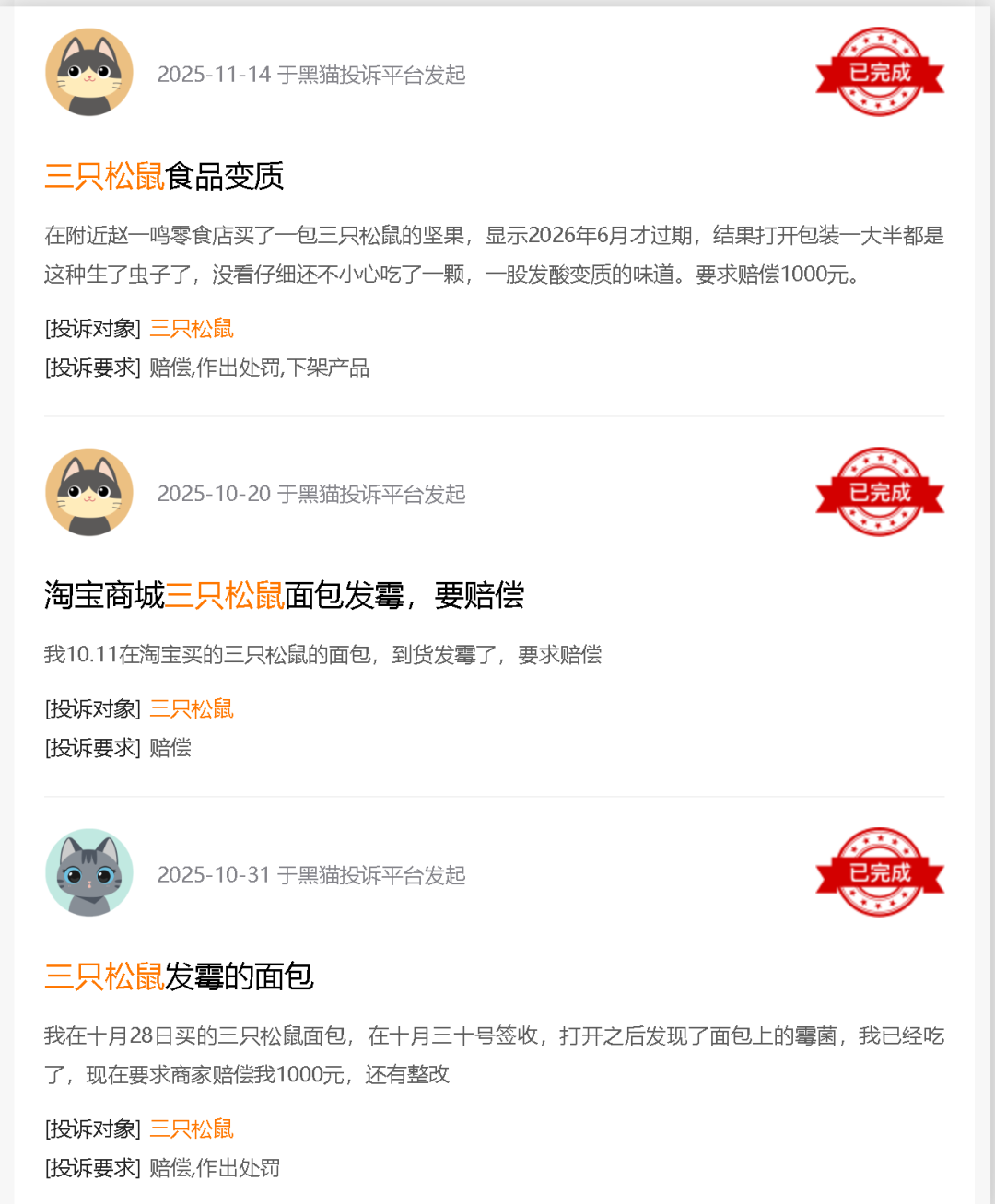 在黑猫投诉平台,三只松鼠的投诉词条近5000条,不少消费者都反映食品有异物、发霉等问题。