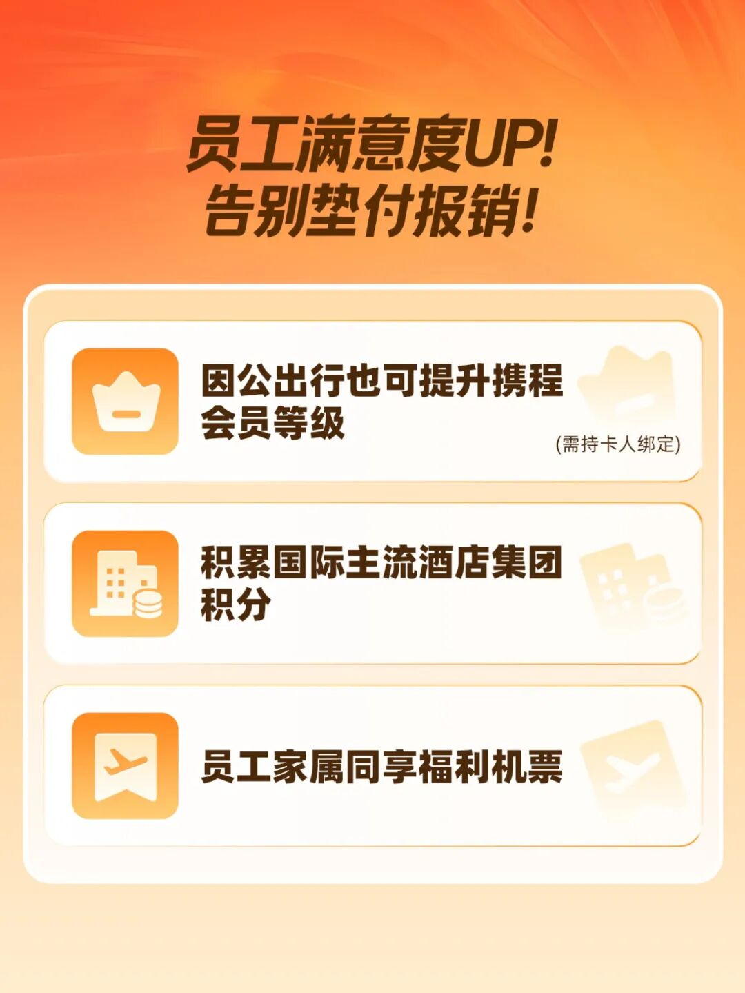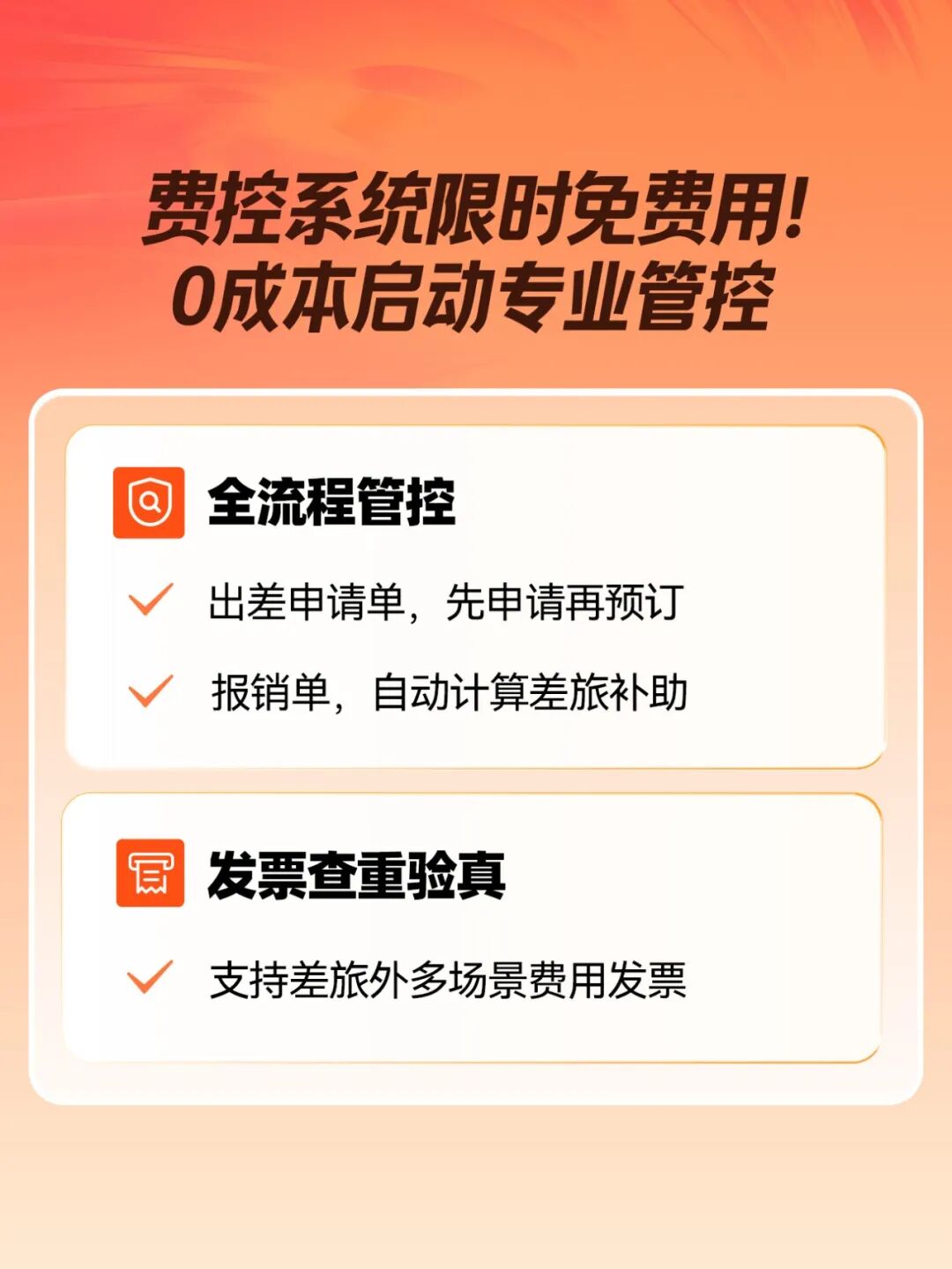 资源和服务,一点不缩水! 全球机票酒店资源,因公出行还能累积携程个人等级分和酒店积分,员工满意度UP! 费控系统现在限时免费开放,发票管理、差旅报告一键生成,太省心了!