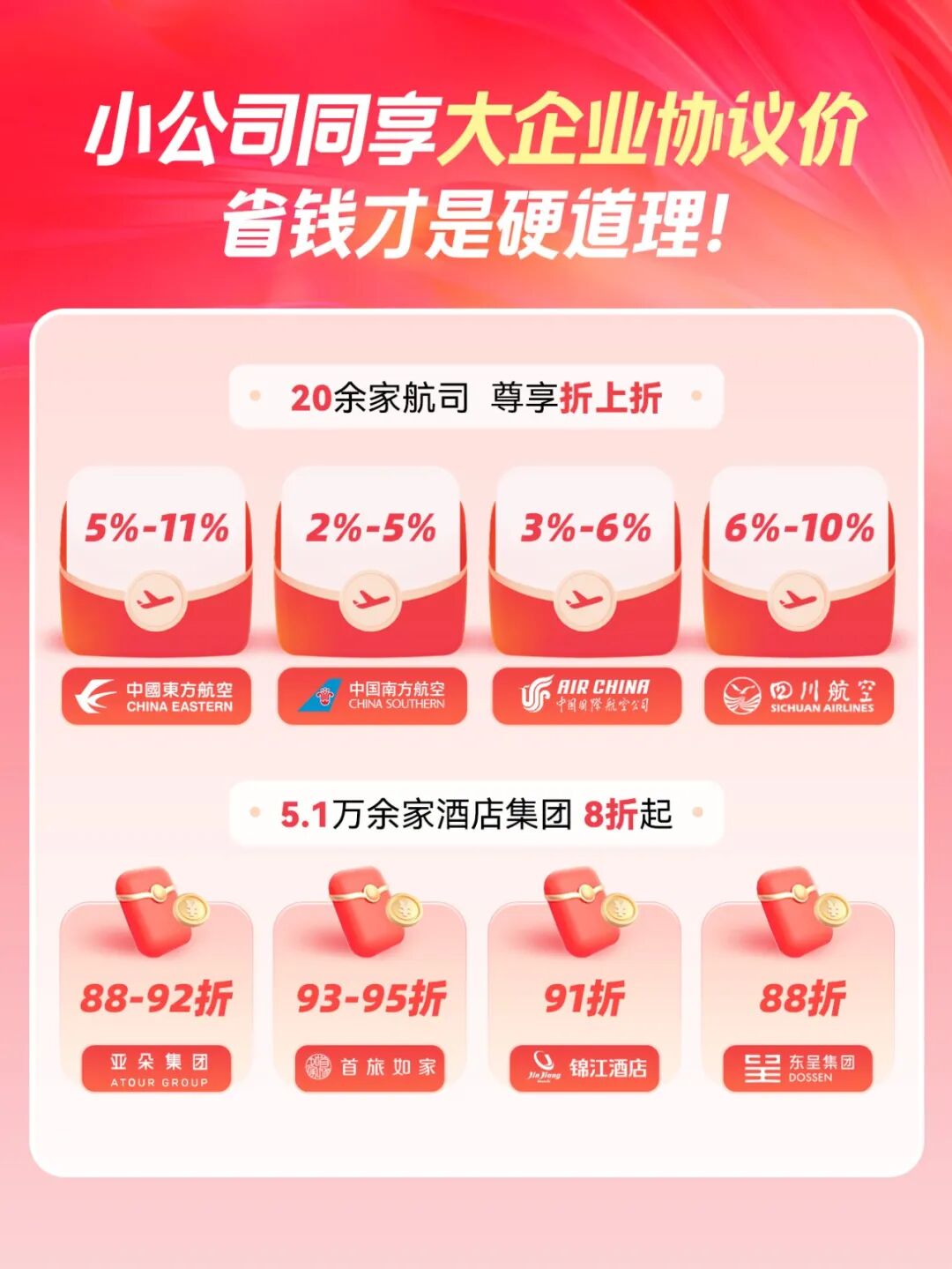 先说省钱,真金白银! 企业协议价,不限消费门槛!小公司也能享受和大企业一样的低价~ 20+航司折上折(2%-11%)+ 5万+酒店集团8.8折起,资源直接拉满 首充1000元就返50元券包,多充多返,差旅成本直接往下降!