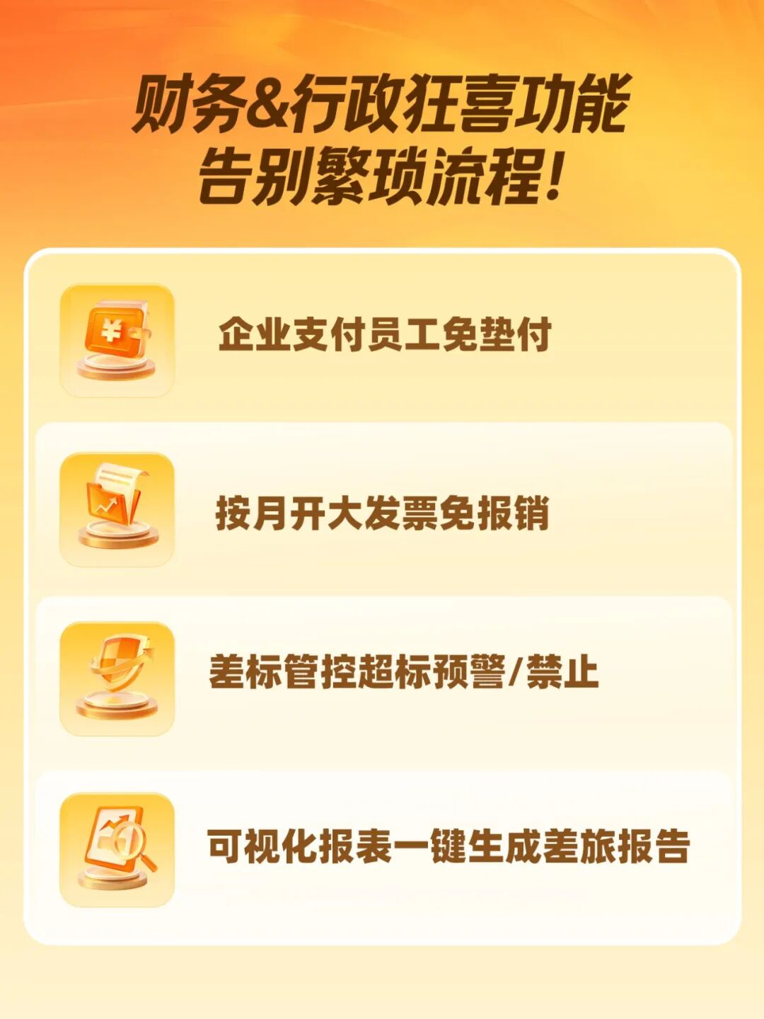 再说管理,效率翻倍! 开通企业月结,员工免垫付,直接免报销!财务姐妹都感动哭了~ 差旅标准一键设置,超标自动预警,费用管控从未如此轻松 对接飞书/企微等OA系统,出差审批流程线上搞定,再也不追着老板签字