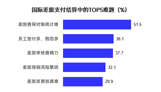 支付是另一个难题。在许多地区,员工只能用个人信用卡垫付费用,然后攒下一堆票据回国报销。流程不仅漫长,还常因汇率波动造成个人损失。携程商旅的报告也印证了这种普遍困境:51.5%的受访企业认为“差旅费用对账统计难”是国际差旅支付中的首要难题,紧随其后的是“员工垫付多,抱怨多”。
