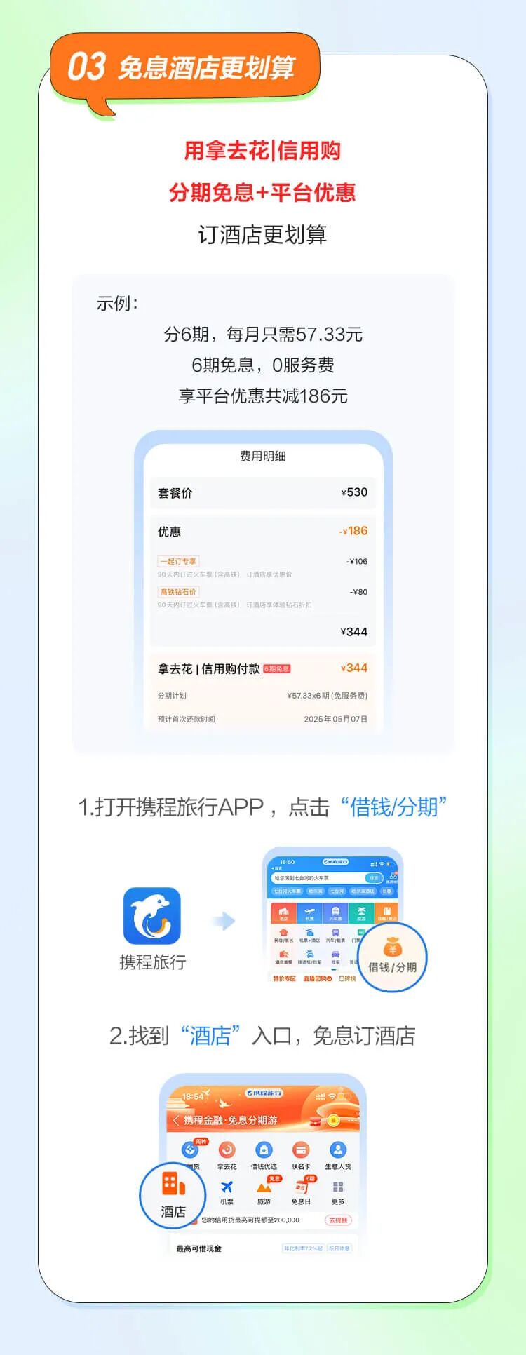 *文中提到的拿去花|信用购页面由携程金融开发,由拿去花|信用购为用户提供信用消费服务。请您理性借贷、合理消费,选择正规渠道使用携程金融相关服务。