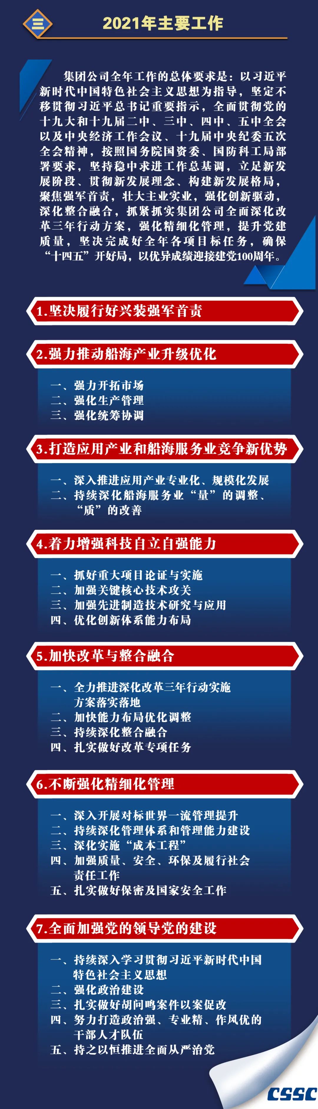 1月27日,在中国船舶集团有限公司2021年度工作会议上,中国船舶集团党组书记、董事长雷凡培作了题为《贯彻新发展理念 强化精细化管理 为加快建设世界一流船舶集团不懈奋斗》的工作报告。