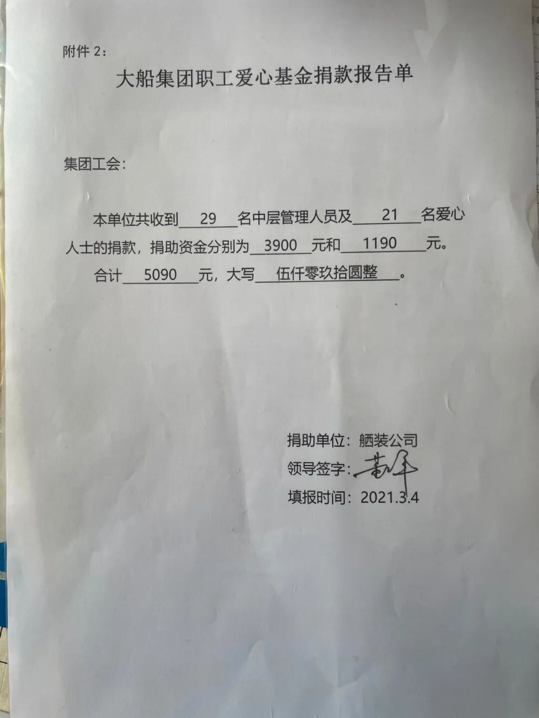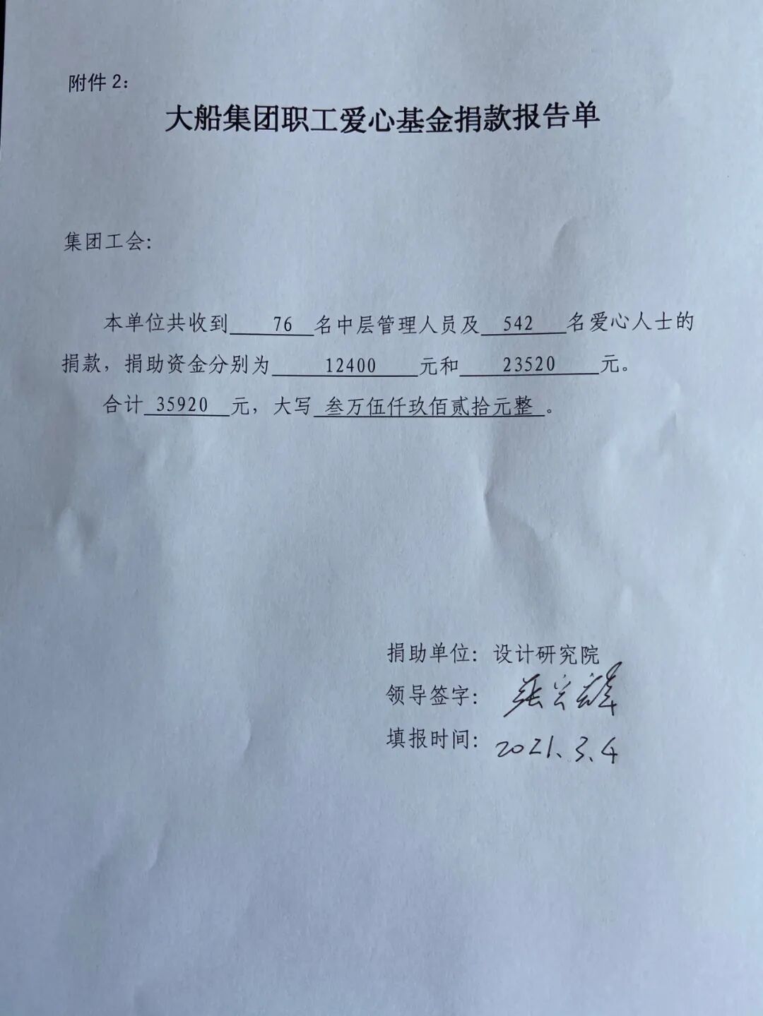 3月5日“爱心日”来临之际,中国船舶大船集团举办了爱心日捐款活动。结合当前疫情防控工作需要,今年爱心捐款活动仍采取线上形式开展。尽管不能亲手将善款投入捐款箱中,但大船人的爱心仍然格外高涨,尤其是设计院等单位爱心人士踊跃捐款,本次“爱心日”捐款活动共得到各方面捐款合计1417295元。