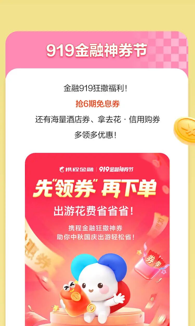 *文中提到的信用贷免息券使用规则详见活动页面介绍;本次生日礼活动仅限9月生日用户参与,其他用户敬请期待您的生日月好礼;文中提到的919神券节活动由携程金融策划、开发,活动具体规则和券说明请以活动页面右上角“活动规则”说明为准。请您理性借贷、合理消费,选择正规渠道使用携程金融相关服务。