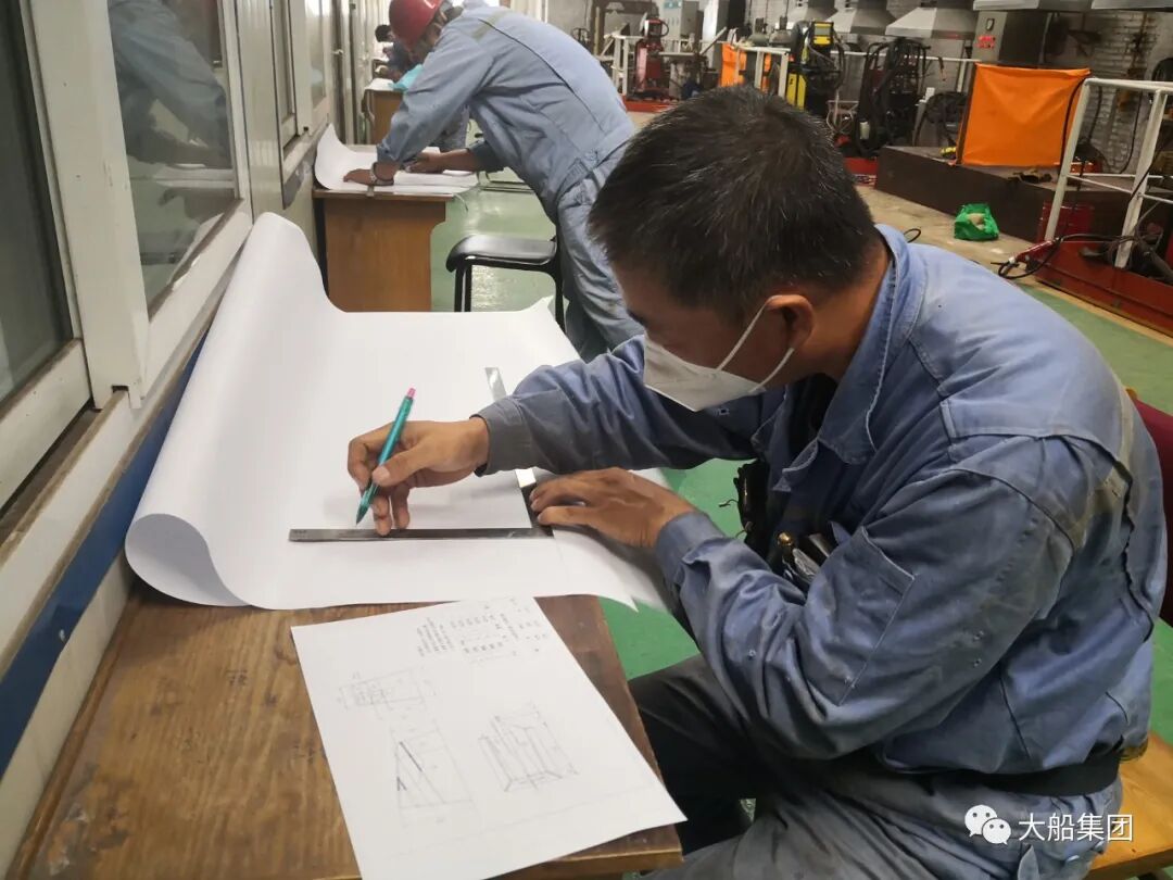 此次船舶装配工比赛采用中国船舶考试新标准,选手们需要在四个小时内完成放样、下料、装配、焊接四个模块比赛内容。为提升参赛选手实际操作水平和大赛竞争力,今年新增的赛前技术培训及复赛环节,为选手们规范了现场放样的考试评判标准。