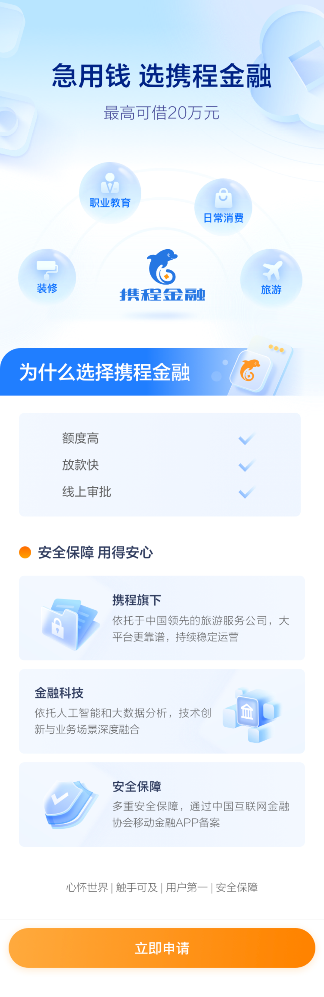*文中提到的信用贷页面由携程金融开发,提供贷款的服务方为和信用贷运营商合作的具有合法贷款资质的机构,请您理性借贷、合理消费,选择正规渠道使用携程金融相关服务。