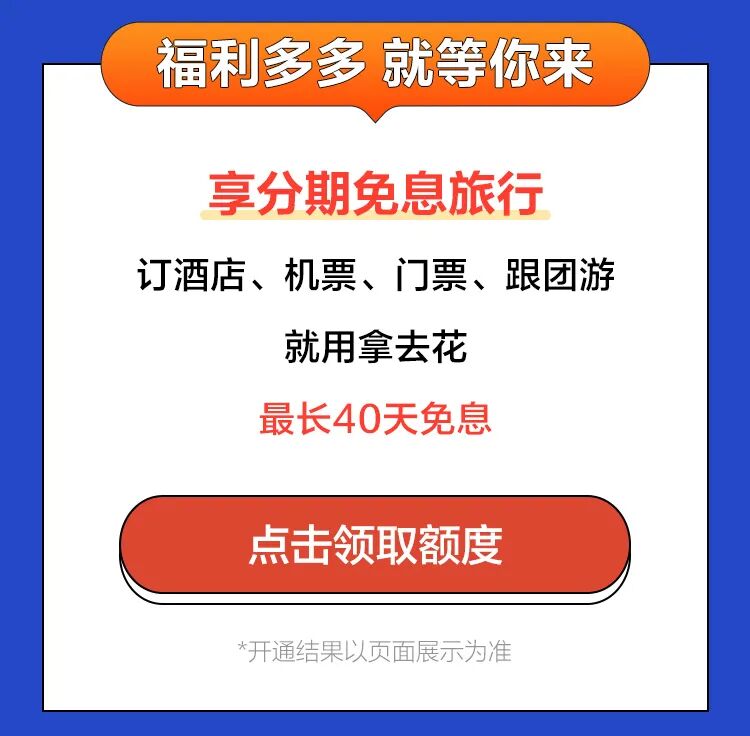 *文中提到的瓜分额度活动页面由携程金融开发;文中提到的信用贷页面由携程金融开发,提供贷款的服务方为和信用贷运营商合作的具有合法贷款资质的机构;文中提到的拿去花页面由携程金融开发,拿去花服务由携程和携程金融提供;文中提到的“携程金融订酒店”页面由携程金融开发,订酒店服务由携程金融提供。请您理性借贷、合理消费,选择正规渠道使用携程金融相关服务。