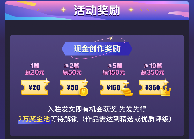 本次活动现金总奖金池为2万元,先发先得,发放现金时将会根据系统记载的笔记发布时间顺序发放现金奖励,笔记发布时间若在奖池现金消耗完毕时间之后,将默认无法得到现金奖励。 -