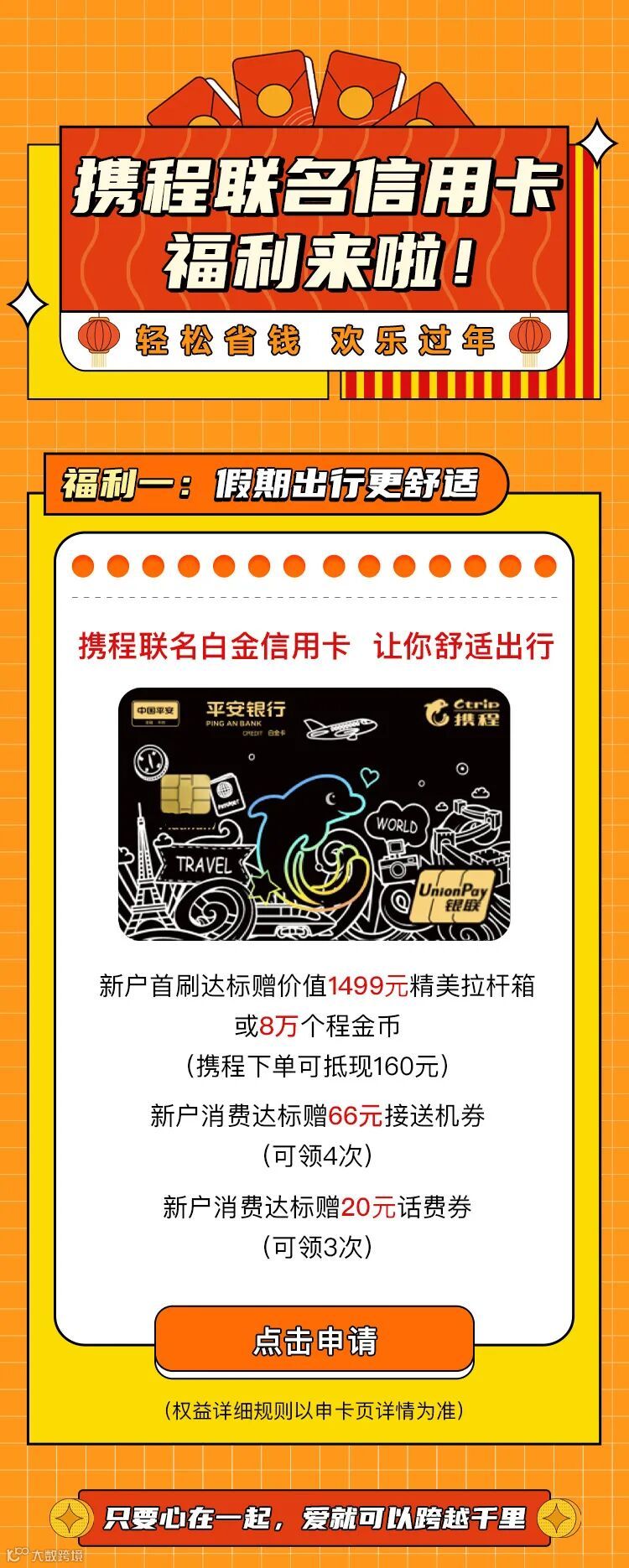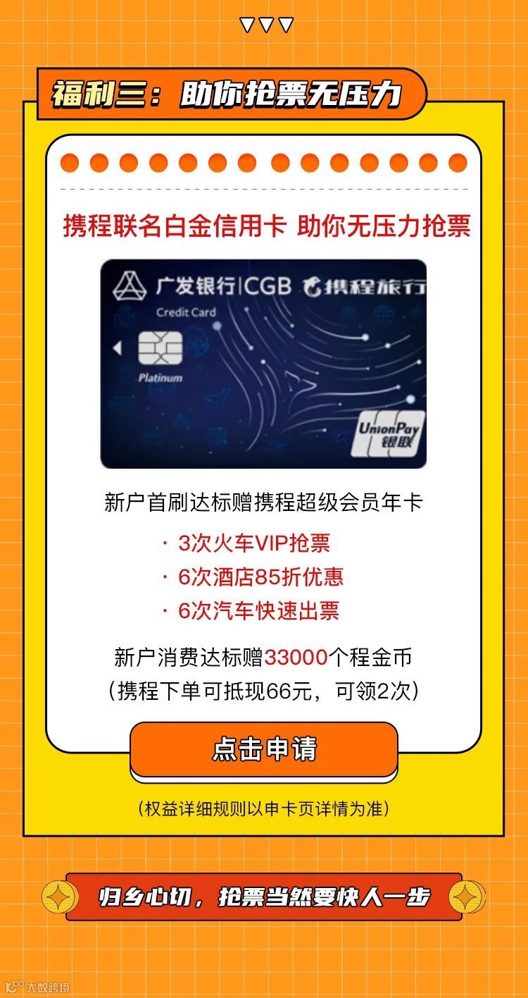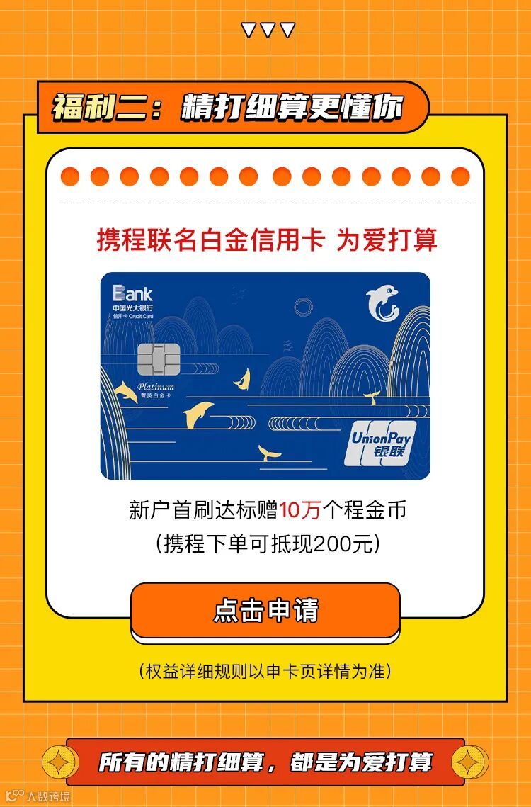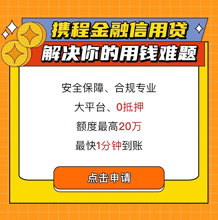 *文中涉及到的金融服务由发卡行提供,实际申请成功与否以对应合作银行审核结果为准,请您根据实际需求理性使用;文中提到的信用贷小程序由携程金融开发,提供贷款的服务方为和信用贷运营商合作的具有合法贷款资质的机构;请您理性借贷、合理消费,选择正规渠道使用携程金融相关服务。