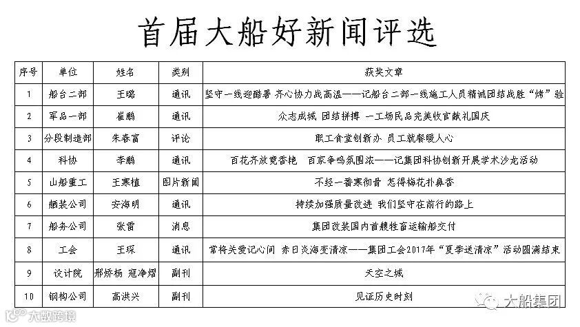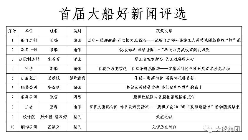 近日,由集团党委宣传部举办的首届“大船好新闻”评选结果“出炉”。经过专家评委的精心评选,来自集团基层员工创作的10件作品榜上有名。