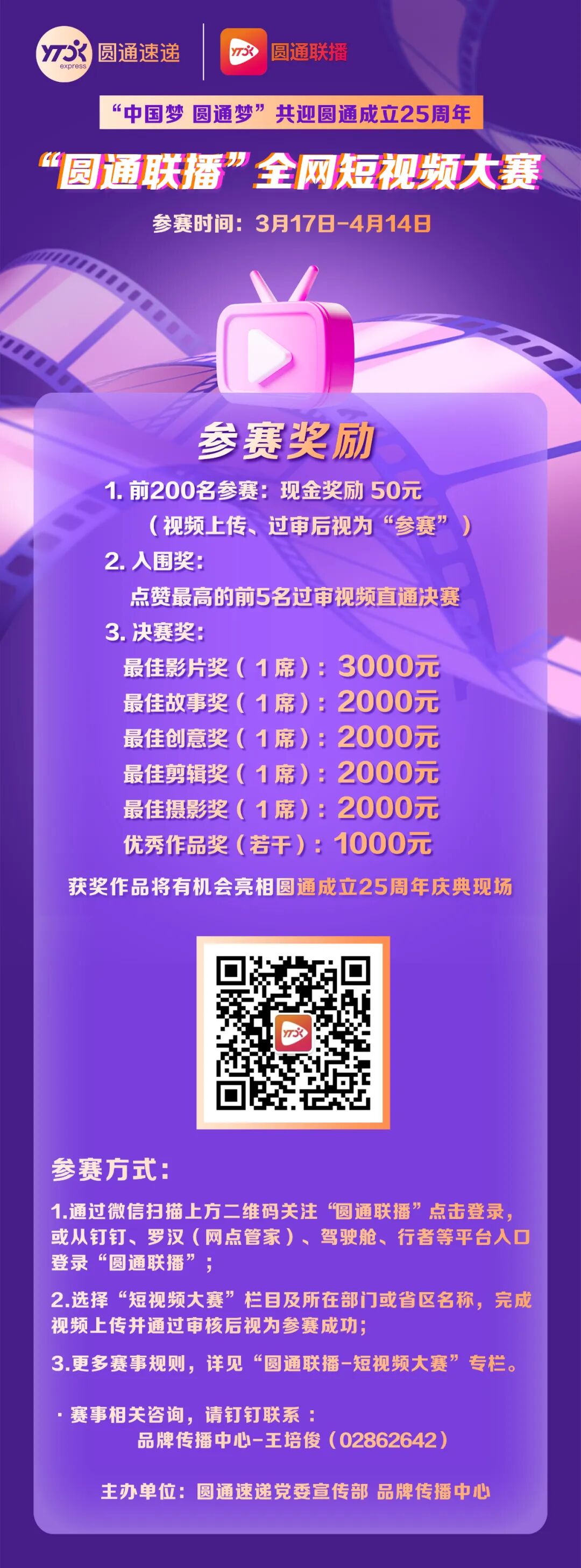 为庆祝圆通成立25周年,现重磅推出"圆通联播"全网短视频大赛,用镜头记录岁月,用创意点亮生活!