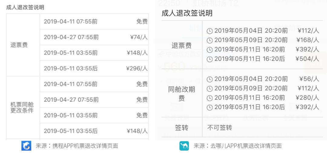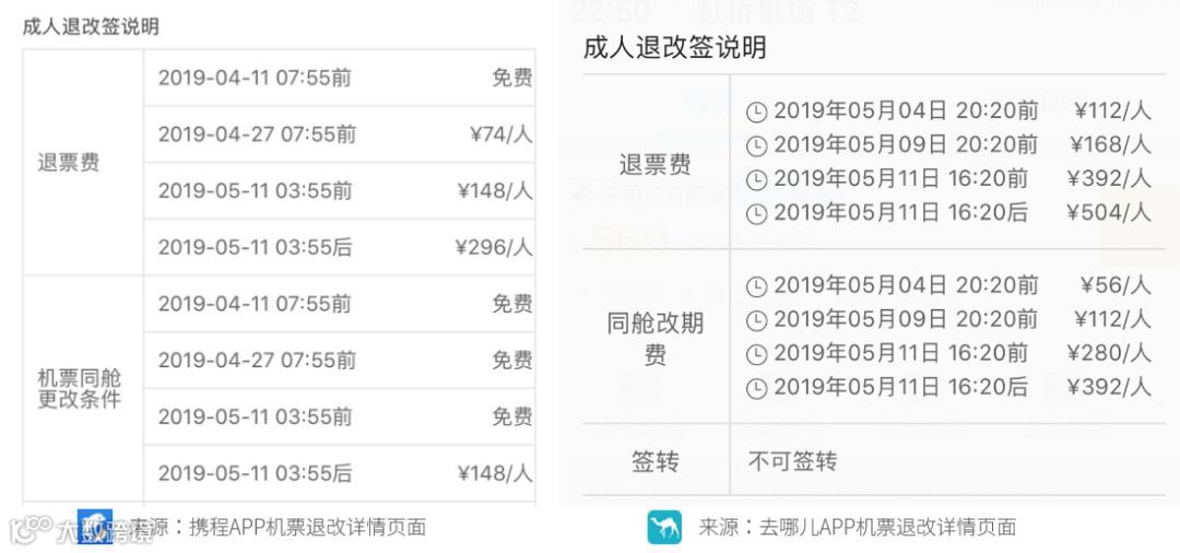小编手动搜索携程、去哪儿两个APP上机票的信息,在退改签一栏确实发现都有明显的阶梯退改签费用的说明。大家购票的时候也要看仔细哦!