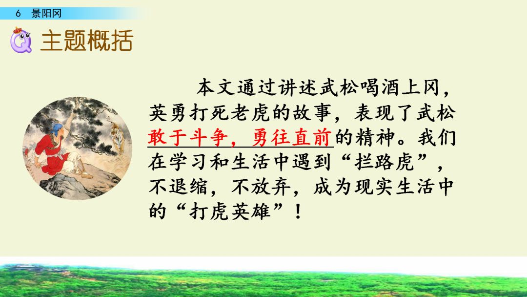 本文记叙了武松在阳谷县的一家酒店内开怀畅饮后,趁着酒兴上了景阳冈,赤手空拳打死一只猛虎的故事,表现了武松豪放倔强、勇敢机智的英雄性格。