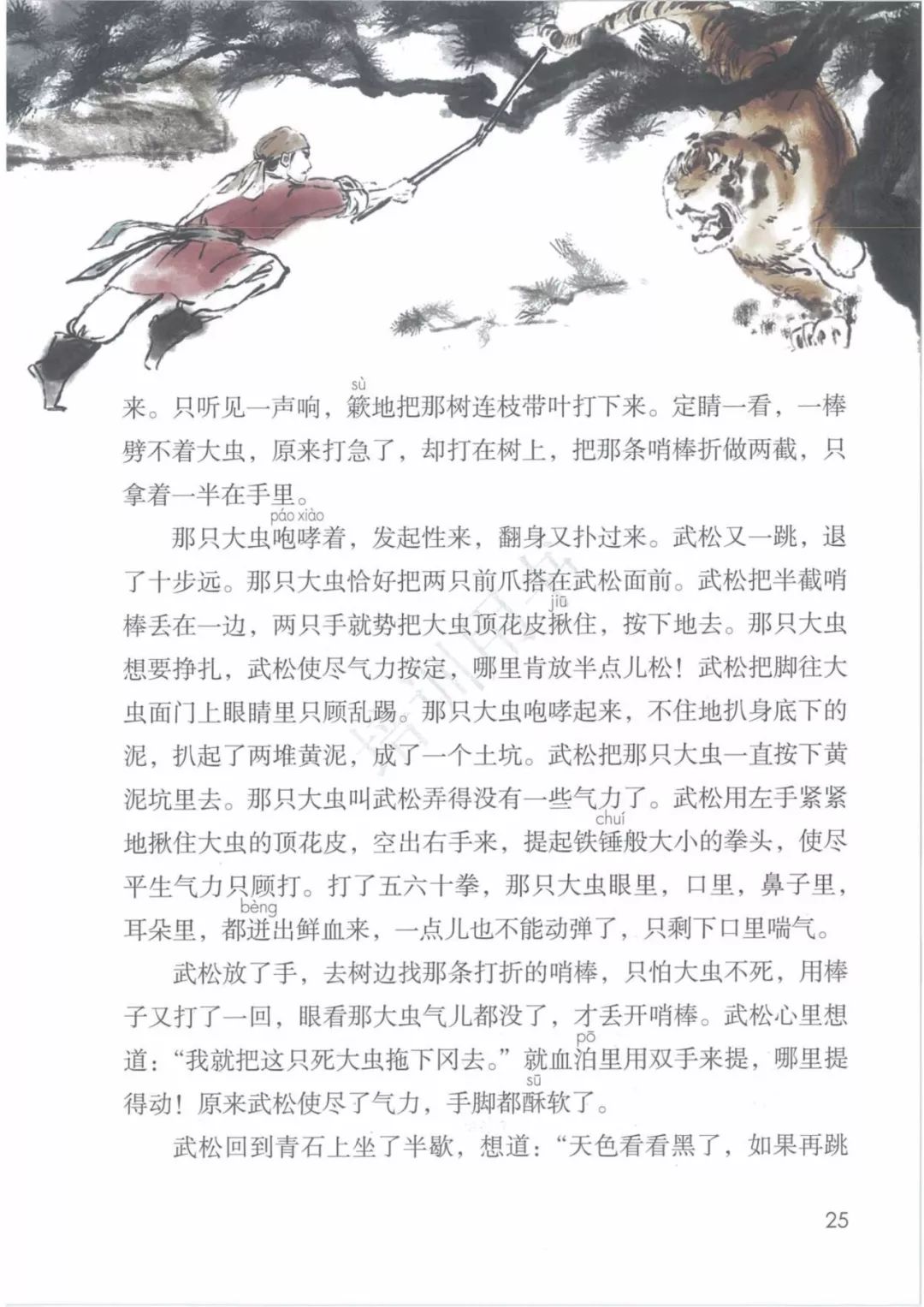 武松见了大虫,惊吓不已,忙从青石上翻身下来,闪在青石边。大虫从半空里撺下来,向武松扑去,武松闪在大虫背后。大虫把前爪搭在地下,把腰胯一掀。武松一躲,躲在一边。大虫又一剪,武松闪在一边。武松抡起梢棒劈向大虫,不料却打在了树枝上,梢棒折成两截。大虫又扑过来,前爪搭在武松面前,武松就势把大虫的顶花皮揪住,把它按下地去,然后朝大虫的面门上眼睛里乱踢。大虫边咆哮边扒身下的泥,扒了个土坑,武松把大虫按下坑里,左手揪住大虫,空出右手,使劲打大虫。打了好多十拳,大虫七窍流血,不再动弹了。