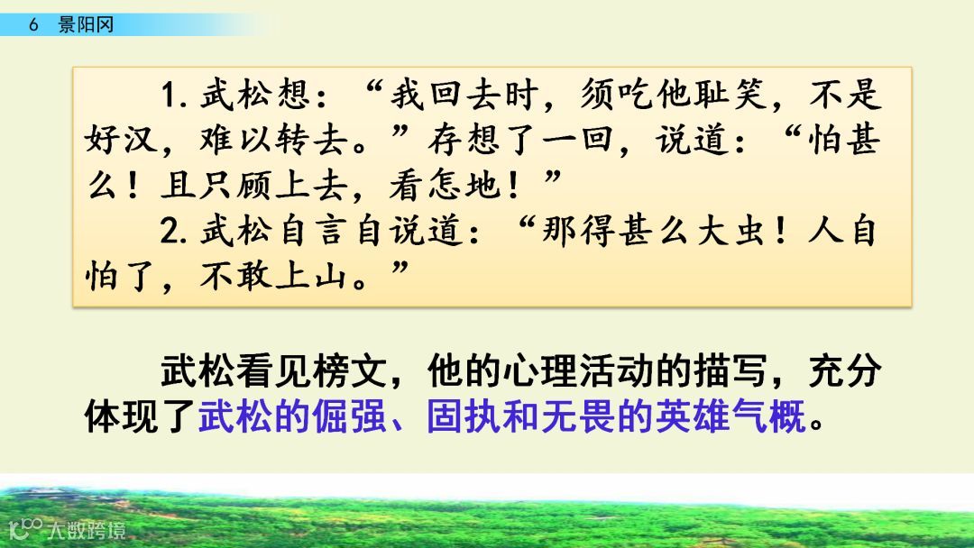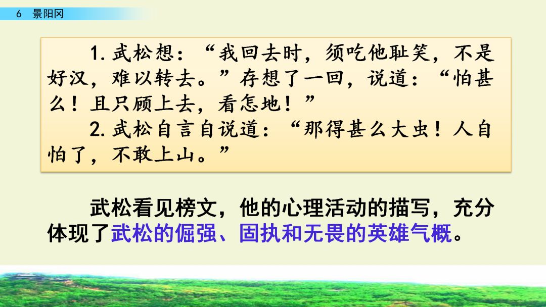 这句话对武松的心理描写非常贴切、真实。武松这时才相信冈上有虎,但是一点也不害怕。武松毕竟是英雄好汉,也出于自尊和面子,他不愿下冈。表现了武松的倔强、固执和英勇无畏的英雄气概。