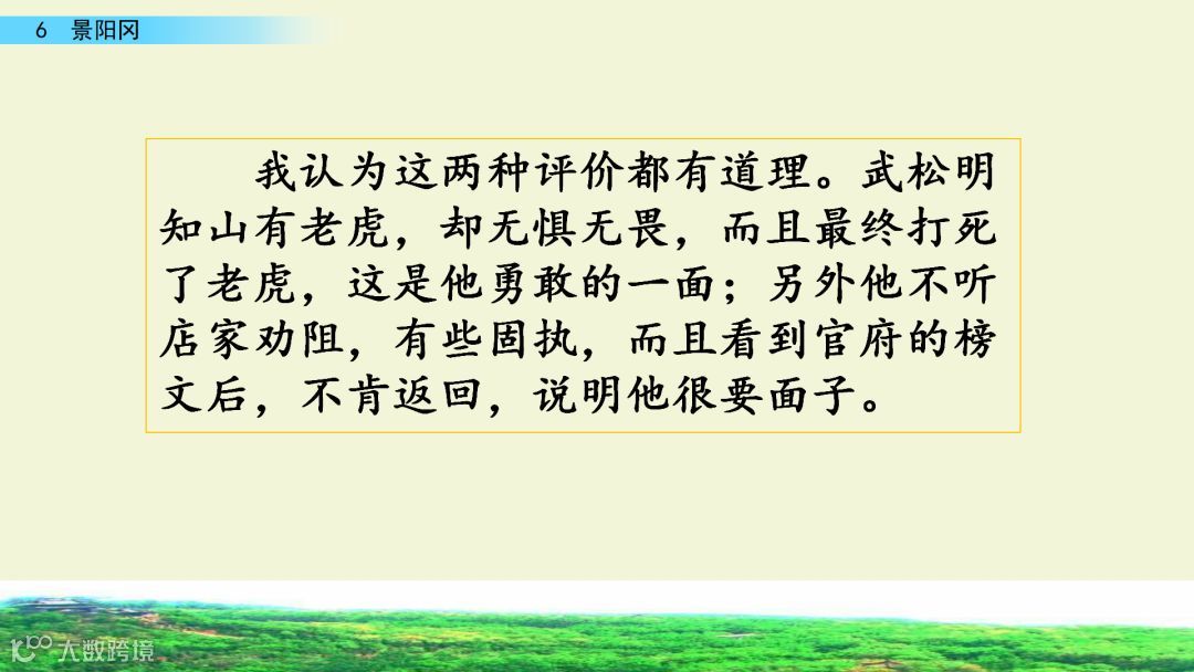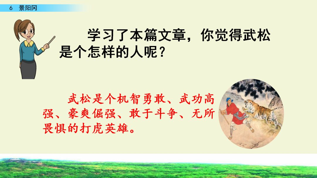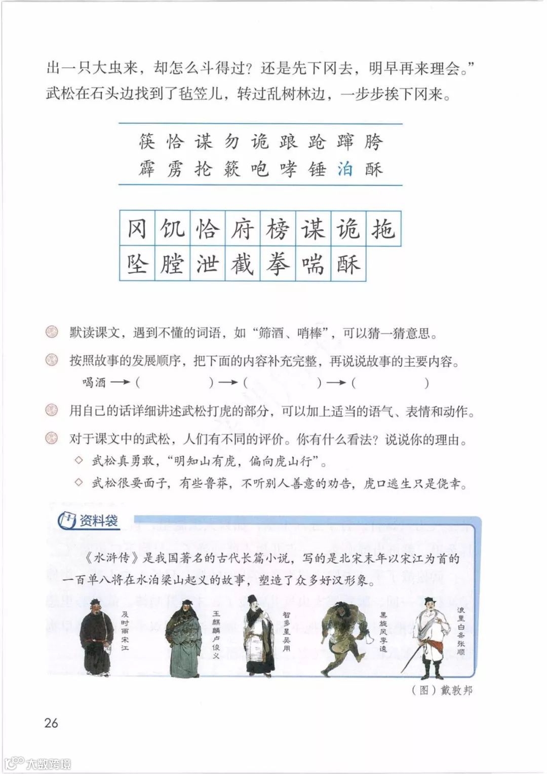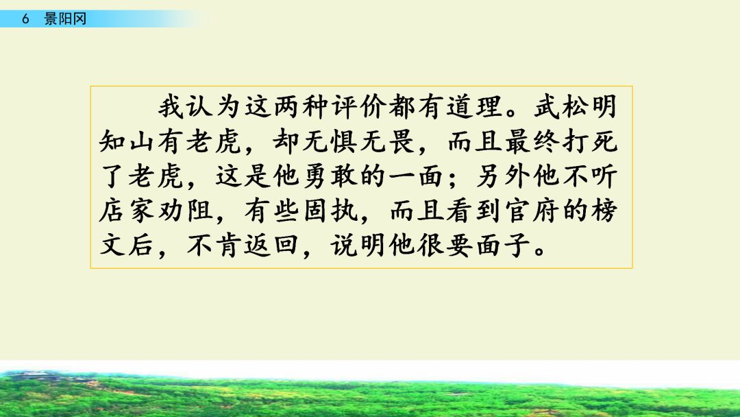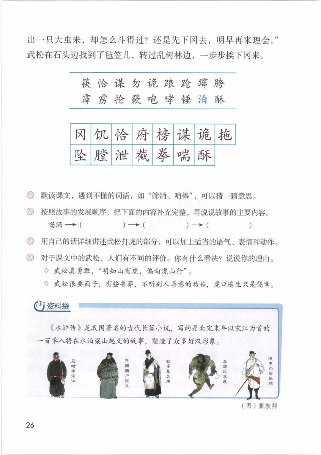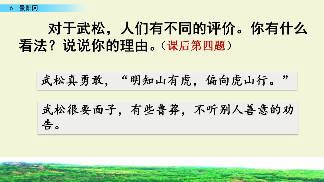 4、 对于课文中的武松,人们有不同的评价。你有什么看法?说说你的理由。