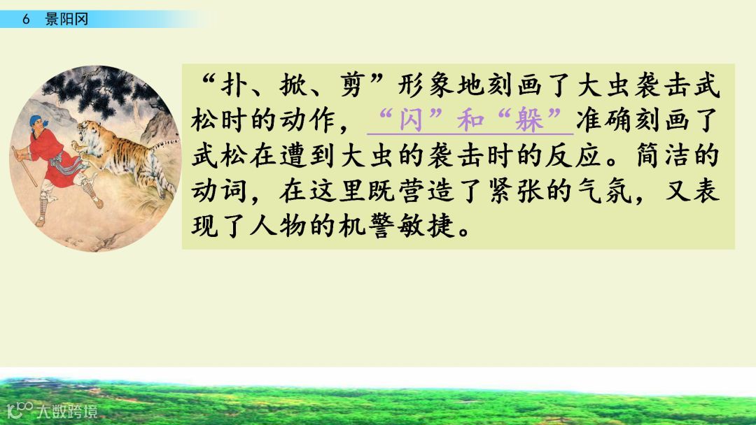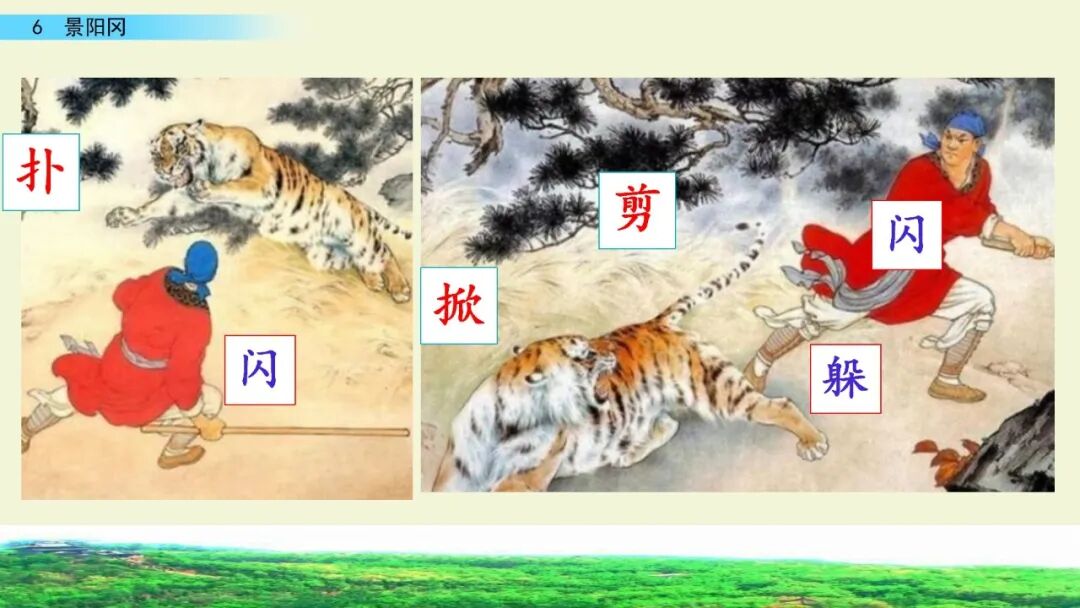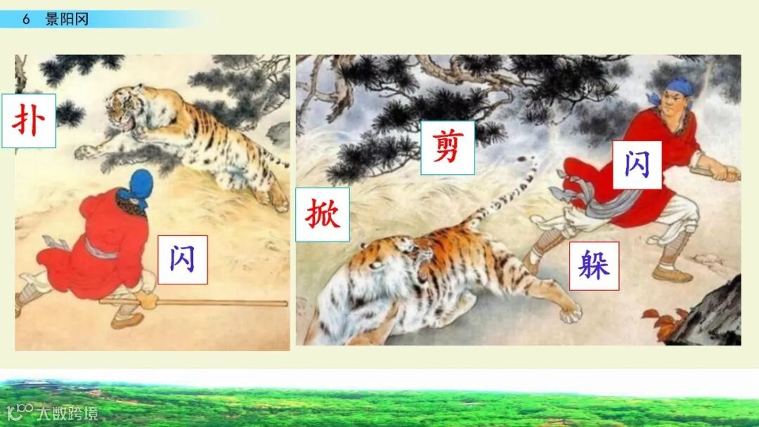 老虎的进攻有三招:“一扑”“一掀”“一剪”,把老虎凶猛残暴、让人生畏的气势显现无遗。详细写虎是为了写人,以虎的凶猛衬托出人的勇猛。